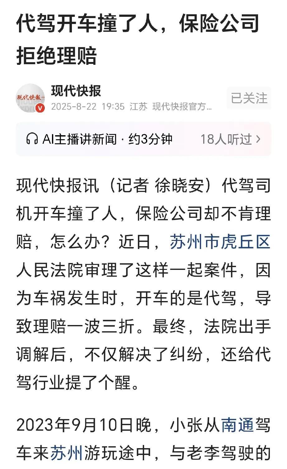 江苏苏州,一男子开车游玩,被代驾开车撞了,男子左侧车灯、保险杠等被撞坏,代驾全责,修车费26000元,代驾的车主申请理赔,保险公司认为,是代驾撞的,该由代驾和代驾公司赔偿,男子耗不起时间,向自己投保的甲保险公司申请代位赔偿,甲公司赔偿后,要求车主保险公司赔偿,依旧遭拒,甲公司告到法院,法院这样判了! 2025年8月22日,据现代快报报道,一男子车辆被代驾司机开车撞了,代驾全责,保险公司拒赔。 小张家在南通,早就有个梦想,想自驾游到苏州逛逛。 2023年9月10日晚,小张一路顺畅,从南通开车到了苏州游玩。 谁知游玩途中,一辆车迎面撞来,小张来不及躲闪,被对方一下撞上。 所幸双方人没受伤,虚惊一场,小张下车一看,车辆左侧车灯、保险杠等部位被对方撞坏。 对方司机赶忙下车,小张这才知道,开车的是代驾司机老李,车主小顾并没有开车。 车主和代驾态度很好,承认是他们的责任,由代驾司机老李承担事故的全部责任。 随后,小张去修车,全部修完之后,车辆维修费一共花了26000元。 小张联系了车主小顾,要他走保险予以赔偿。 小顾十分配合,立刻向他投保的公司提起理赔申请,可万万没有想到,该保险公司拒绝赔偿。 保险公司认为,车辆出事故时,不是车主小顾驾驶,是代驾老李驾驶的车辆。 是老李不小心驾驶,才导致的撞车事故发生,因此,保险公司认为,修车费应该由代驾老李和老李所在的代驾公司赔偿。 小顾气的和保险理论,保险公司态度坚决,是你叫了代驾才出了事故,又不是你自己撞的,是代驾司机全责,保险对此不承担责任! 小张迟迟得不到赔偿,他家在南通,耗不起时间。 小张于是想了个办法,他向自己的甲保险公司提出《“代位求偿”案件索赔申请书》,要求甲公司先给自己垫付修车费。 提出代偿的同时,小张将事故理赔权转让给了甲保险公司。 随后,小张顺利获得了甲保险公司垫付的车辆维修费,然后离开。 甲保险公司为小张先行垫付损失之后,转而向车主小顾的保险公司(以下称乙保险公司)提出理赔要求,可依旧被乙保险公司拒绝。 随后,甲公司到法院起诉,要求乙公司履行赔偿义务。 有人认为,老李是有驾驶证的司机,保险公司拒赔的理由是什么?交通法明文规定酒驾违法,这样才有的代驾,代驾出了事故拒赔,这是哪家的规定? 也有人说,买保险的时候说是跟车不跟人,理赔的时候各种理由拒赔,如果这里面的代驾司机换成司机的配偶或者家人,那是不是这保险就等于白买了? 保险保的是某台车,不是某个人,只要是跟车有关系的问题,根据责任认定,保险公司履行赔偿责任没有任何疑义。 毕竟谁家的车也不可能固定由一个人驾驶的,至于车主是否追究代驾人员及代驾公司责任,那该另当别论。 但乙保险公司始终认为,老李是有偿使用车辆,事故也是老李造成,因此,损失就理应由老李和代驾公司进行赔偿。 那么,这件事在法律上是怎么认定的呢? 《交强险条例》第3条规定:本条例所称机动车交通事故责任强制保险,是指由保险公司对被保险机动车发生道路交通事故造成本车人员、被保险人以外的受害人的人身伤亡、财产损失,在责任限额内予以赔偿的强制责任保险。 商业三者险通常约定:被保险人或其允许的合法驾驶人在使用被保险机动车过程中发生意外事故,致使第三者遭受人身伤亡或财产直接损毁,应当由被保险人承担的损害赔偿责任,保险人依照本保险合同的约定,负责赔偿。 本案中,代驾司机老李是车主小顾允许的合法驾驶人,老李具备相应驾驶资格。 交强险的保障对象是被保险机动车发生的事故,而非特定驾驶人。 商业三者险的核心也是“保车不保人”,只要是被保险人允许的合法驾驶人使用车辆,保险公司均需承担赔偿责任。 乙保险公司以“不是车主驾驶”为由拒赔,违背了保险合同“跟车不跟人”的基本逻辑。 即使驾驶人是代驾,有偿或无偿,只要符合“合法允许”的条件,保险公司就无权拒绝赔偿。 《保险法》第60条第1款:因第三者对保险标的的损害而造成保险事故的,保险人自向被保险人赔偿保险金之日起,在赔偿金额范围内代位行使被保险人对第三者请求赔偿的权利。 小张作为被侵权人,有权选择向全责方,代驾老李、车主小顾或其保险公司索赔。 因乙保险公司拒赔,小张向自己的甲保险公司申请代位求偿,即“先赔后追”,并将理赔权转让给甲保险公司,符合《保险法》的规定。 甲保险公司向小张赔付后,依法取得了小张对乙保险公司的赔偿请求权。 乙保险公司作为全责方车辆的保险人,应当在保险责任限额内承担赔偿责任。 乙公司拒绝甲保险公司的追偿请求,违背了代位求偿的规定。 最终,经过法院的调解,双方调解成功,由乙公司向甲公司支付甲公司给小张先行垫付的维修费款项,案件受理费由代驾老李承担。 对此,你怎么看?欢迎评论区留言讨论。 关注@王哥说法,学法律知识。 #头号创作者激励计划#