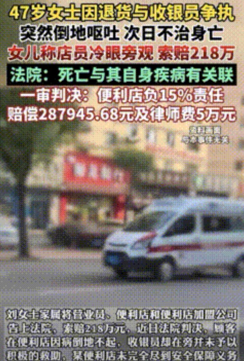 上海,47岁女子到便利店买啤酒,付完款还没出店门就要退款,收银员要小票,女子找不见收银员不给退款,女子就拦着收银员不给其他顾客结账。争执过程中女子打了通电话后倒地不起,收银员见状赶紧翻找小票,无视女子倒地行为。等女子家人赶到后,女子开始呕吐,收银员递过去2块抹布。女子被送医次日后不治身亡,家属认为便利店未尽到安全保障义务,起诉索赔218万元,便利店认为女子系自身疾病倒地不应赔偿,法院最后这样判决。 据广州日报8月23日报道,女子买东西因退款问题跟收银员发生争执,倒地后不治身亡,家属认为是收银员见死不救,便利店认为是女子自身疾病,法院却是这样判决的。 在2023年11月17日晚上6点多,47岁的刘女士到家附近的便利店购买啤酒,付了款转身准备离开,但是还没等走出店门就折返回收银台,说要退款。 刚刚才付了款买好的东西,马上就要退款,收银员兰女士也真的是见得多了,没有办法,只能照章办事,拿出来小票就给退。 但是刘女士翻翻左兜又翻翻右兜,却怎么都找不到小票,明明连屋都没出去,怎么就找不见小票了? 后来刘女士好像有点印象了,小票她压根就没拿到手,应该在收银台那里。然后就跑到收银台边上放着的垃圾桶翻找小票,可是半天都没有翻到购买啤酒的小票。 越是找不见,刘女士心里越急,这门都没出去,怎么就找不见,难道找不见小票就不能给退款了? 最后刘女士也没有翻找出来那张购买啤酒的小票,但是她执意要求兰女士给她退款,跟兰女士两个人争执了起来。 兰女士正在给其他顾客结账,没工夫跟刘女士争辩,刘女士看收银员兰女士不理她,就开始阻挠起兰女士给其他顾客收钱,要兰女士先给她退款,说门都没出去,凭啥就不给退款? 两个人你一言我一句争执不下,刘女士突然用手抓着头,面露痛苦神色,拿出手机打出去一通电话,然后就突然倒在了地上。 众人赶紧离开刘女士的身边,兰女士见状赶紧去垃圾桶里翻找小票,就在兰女士翻找小票的过程中,刘女士的家人赶到后赶紧报警。 与此同时,刘女士也开始呕吐,兰女士抓起收银台的2块抹布递给刘女士家人,让他们擦拭呕吐物。 后来刘女士被送往医院救治,次日死亡。家属全然不知倒地是什么原因导致的摔倒,但是事情是在便利店里发生的,只能查询便利店的监控才能还原真相。 刘女士家属报警后,警方调取了便利店的监控录像,因没有声音,只能从图像上看出,刘女士倒地后,兰女士压根就没管,甚至从始至终连收银台都没有出来过。 刘女士家属认为,如果兰女士能够及时的救治并拨打报警电话的话,可能刘女士就不会错过最佳抢救时间,刘女士家属认为兰女士存在过错,要求其赔偿。 但是兰女士和便利店在事情发生后,一句道歉的话都没有,甚至都没有垫付医药费用。刘女士家属一气之下就把兰女士、便利店以及便利店加盟商一起告上法庭,索赔218万元。 刘女士的家属认为,兰女士身为便利店的员工,却在顾客发生意外的情况下无动于衷,没有及时报警并救治,延误最佳治疗时间,存在错过,应该做出赔偿。 根据《民法典》第1198条的规定:宾馆、商场、银行、车站、机场、体育场馆、娱乐场所等经营场所、公共场所的经营者、管理者或者群众性活动的组织者,未尽到安全保障义务,造成他人损害的,应当承担侵权责任。 刘女士是在跟兰女士因退款事宜争执的过程中发生的意外倒地不起,兰女士身为便利店的工作人员,对于顾客的生命及财产安全未尽到保护的责任和义务。 因兰女士没有及时施救导致刘女士错过最佳的抢救之间,最终导致刘女士的死亡。家属认为兰女士和兰女士工作的便利店以及加盟商存在过错,应对刘女士的死亡赔偿218万元。 兰女士和便利店并未出庭,只有加盟商的代表律师出庭答辩。律师辩称,刘女士的死亡属于由于自身疾病导致,并非是与兰女士争吵导致。 而且兰女士在得知刘女士要求退款时,是按照规章制度索要小票办理退款,其行为并无过错。 至于兰女士没有及时施救是因为兰女士并非是专业的医护人员,所以才没有采取施救行为。但是在刘女士家属救治刘女士有需要的时候,兰女士主动递给2块抹布擦拭呕吐物。 加盟商认为,便利店以及兰女士已经尽到了安全保障的义务和责任,刘女士的死亡与兰女士没有任何施救行为并无关联,不需要赔偿。 法院审理后认为,便利店应当在顾客有危险后及时给予最基本的帮助,及时拨打110或120求助,但是便利店却未完全尽到安全保障义务,应予以赔偿。 刘女士的死亡与自身疾病有很大关系,所以在评定责任时,也会考量进去。 最终法院认定由便利店承担15%的赔偿责任,即赔偿287945.68元,刘女士家属的律师费用50000元,也由便利店赔偿。 对于这起赔偿的官司,您又是怎样看待的呢?