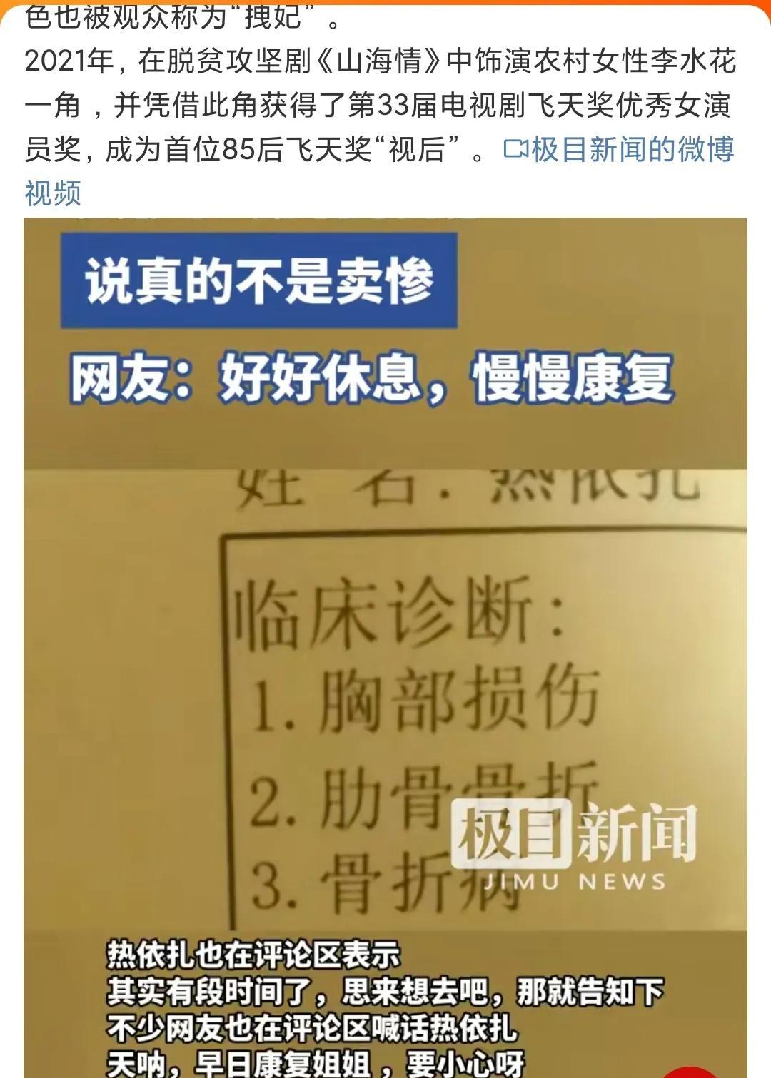 8 月 24 日凌晨,热依扎发文自曝肋骨骨折,晒临床诊断,称不是卖惨 。 网友纷纷留言关心:“早日康复!” 热依扎曾凭《甄嬛传》“拽妃”走红,又凭《山海情》水花获飞天奖视后。 #热依扎#