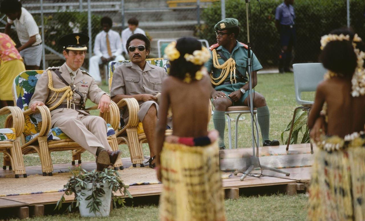 少女献舞,查尔斯王子悠闲的坐在椅子上,脸上露出惬意的微笑。 查尔斯三世在年轻的时候,长相还是蛮清秀的。在王室的各种规则下长大的他,难免无趣一些,遇上如此有趣的活动,他颇为高兴。 图 :1975年9月13日,查尔斯三世,当时的威尔士出席巴布亚新几内亚独立日活动。