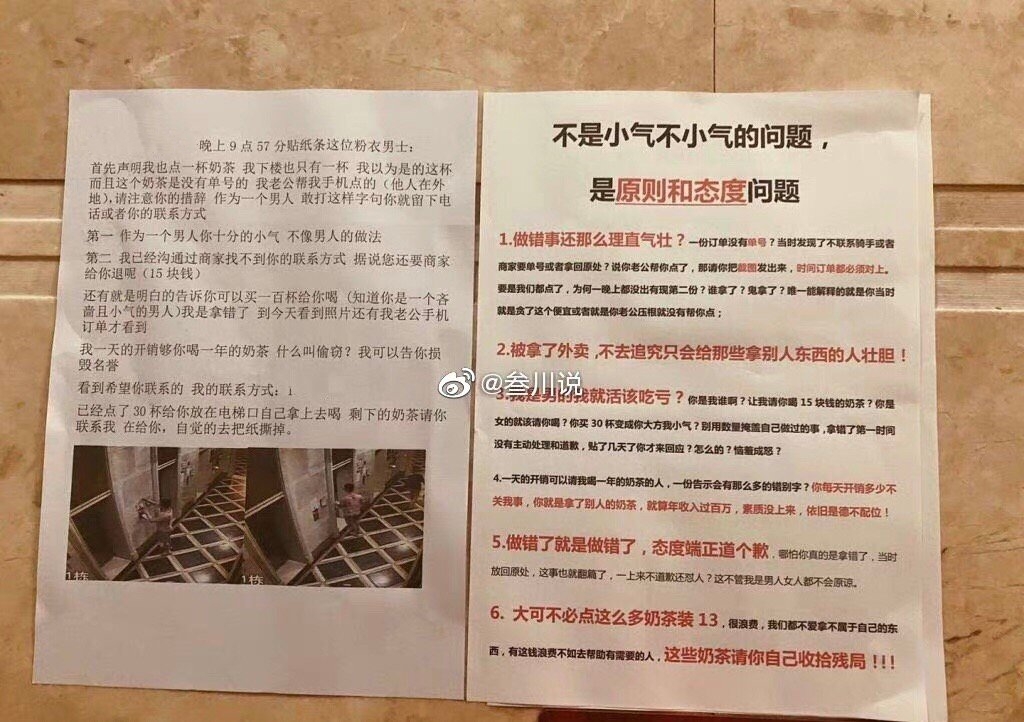 朋友小区,有一个男业主的外卖奶茶被别人喝了,于是贴了一张带监控的公告在电梯口,喝茶的怒订30杯还回去,顺便打了套拳