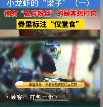 浙江宁波,男子看到一家店推出活动,99元可以吃6斤小龙虾,他非常兴奋,赶紧去买,可当他要打包拿走时,却被店员阻拦了,店员说只可以堂食,男子不服,认为该店存在套路,坚决要打包带走,这时冲出来了4个人,男子只好表示,能不能吃不完再打包带走,店家怒诉道,他在威胁我。 浙江宁波有家烧烤店搞了个活动,99元就能吃6斤小龙虾,结果好多人都去了。司徒先生看到这个活动后,立马就买了一份,打算带回家给亲戚朋友尝尝。可他提出要打包时,店员说不行,只能在那儿吃,打包的话得加钱。司徒先生觉得这是店家在玩心眼儿,一下子火了。 店家那边说活动上写了只能在那儿吃,不能打包。争着争着,店老板张王先生也来了,两人说话越来越冲。司徒先生说自己有5万粉丝,要把这事儿发到网上。王老板可不吃这一套,两人越吵越凶,最后只好报了警。警察来了以后,问了问情况,司徒先生就说,他愿意在店里吃,吃不完再打包带走,王老板也点头同意了。这事看起来就这么解决了。 可没想到,后来他俩都在网上发了视频,视频还都剪过,这下就在网上闹得沸沸扬扬了。最后还是媒体出来说话,才把事儿给说清楚。结果呢,因为他俩在网上乱说,都犯了法,得受行政处罚。