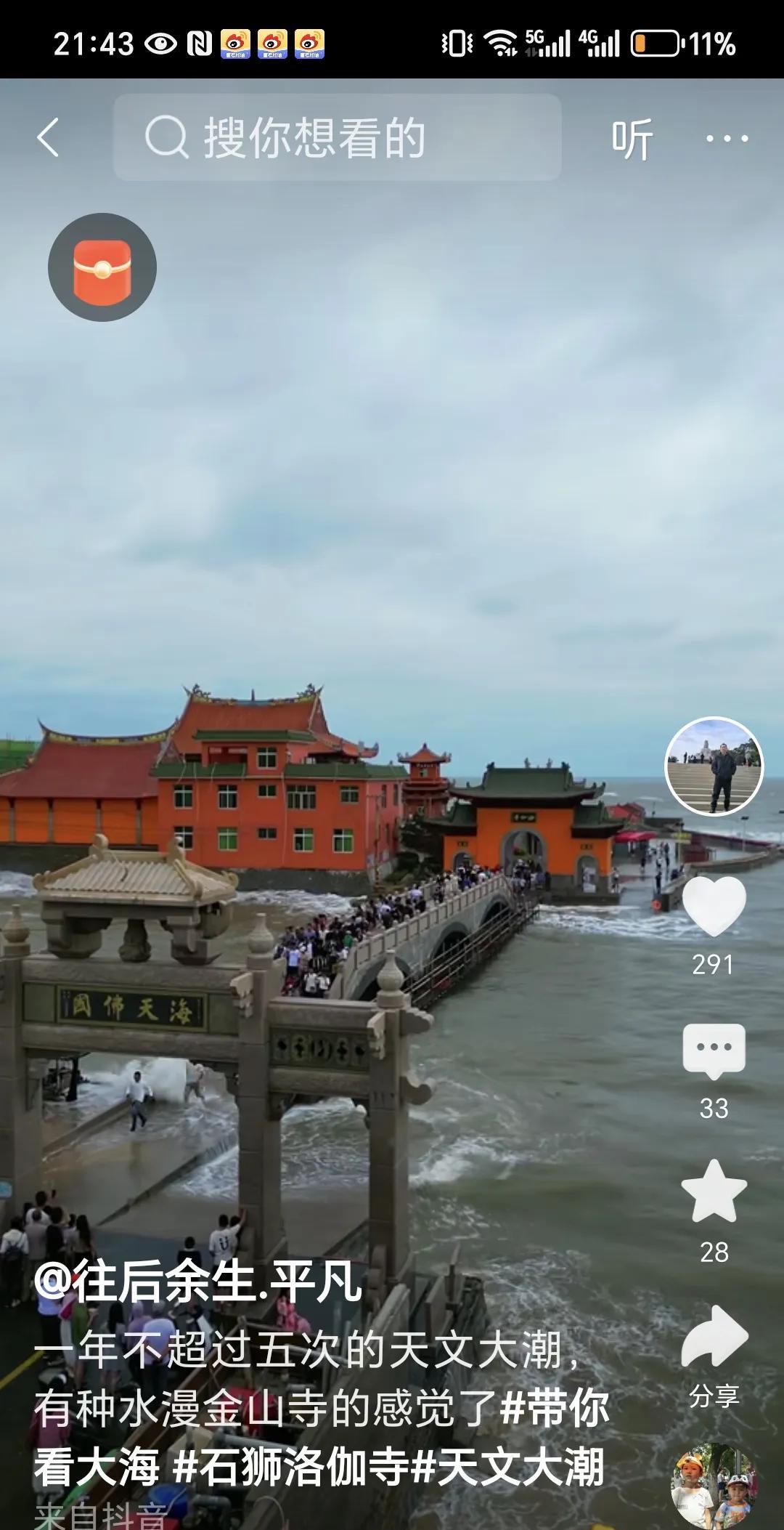 珞珈寺这地方真是太奇妙了, 宛如《白蛇传》中水漫金山的视角感。 它就是位于我国福建石狮的洛迦寺。 这个寺处于闽南黄金海岸东畔宫屿岛上, 是一座建在海上的寺庙。 每当涨大潮的时候, 海水就会淹没连接寺庙与陆地的沙滩。 海水汹涌澎湃的扑向寺庙, 淹没室内的道路, 这种感觉确实太神奇了, 犹如法海在施法。 与白娘娘斗法, 这个地方有机会确实值得人们去一看。