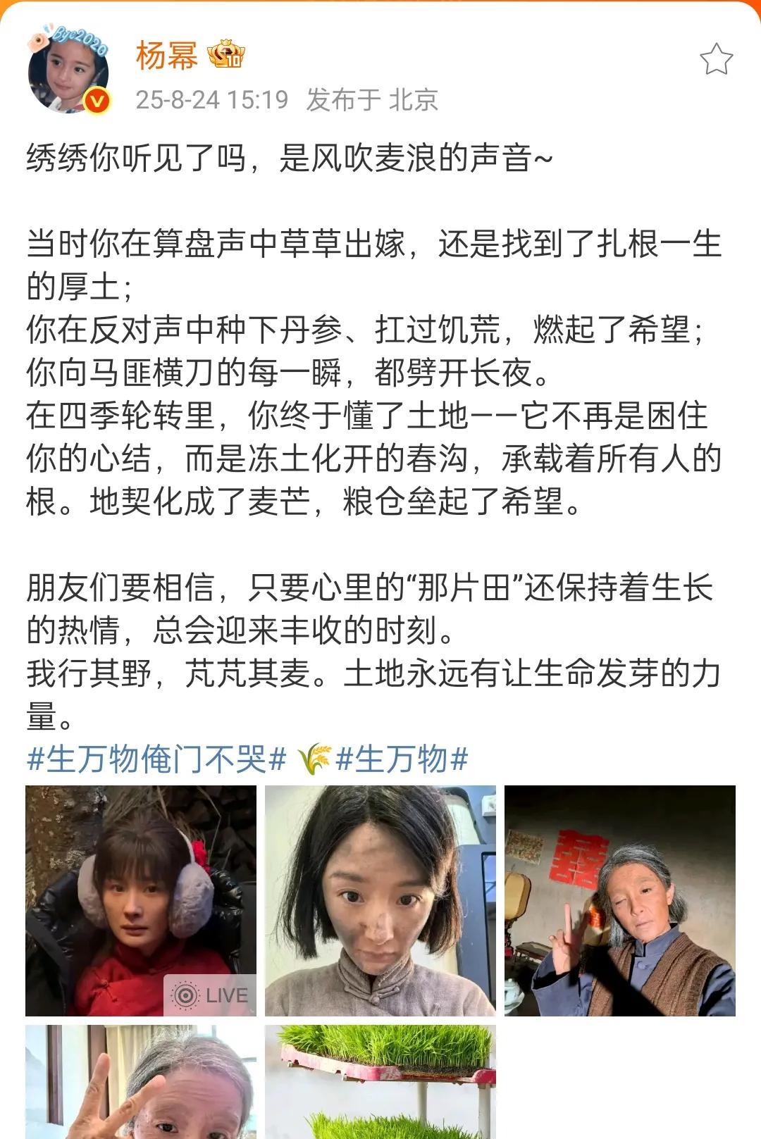 杨幂发文与绣绣告别,文笔让人不敢相信。 《生万物》昨晚迎来了大结局,绣绣虽然活着,但身边的亲人都一个个离开了她。 苏苏走了,老爹没了,大脚去了,公公死了,这些人都曾经在苦涩的岁月里给予她温暖和希望,像一道光照亮她的生活。 可惜的是,这些光亮都一点点消失了,只留下绣绣一个人面对生活,走向白发苍苍。 最后时刻,当老态龙钟的绣绣在窗子里看到一位位过世的亲人时,让人潸然泪下。 刚刚,杨幂发了一篇写给绣绣的小作文,安慰她,赞美她,鼓励她,虽然没有太多煽情,但依然看得泪流满面。 同时她还还晒出了自己的一些照片,有拍戏现场的,有老年妆的,还有脸上抹灰的。 没想到,这篇小作文功底深厚,文字极富穿透力,如果是杨幂自己写的,那真是令人刮目相看。