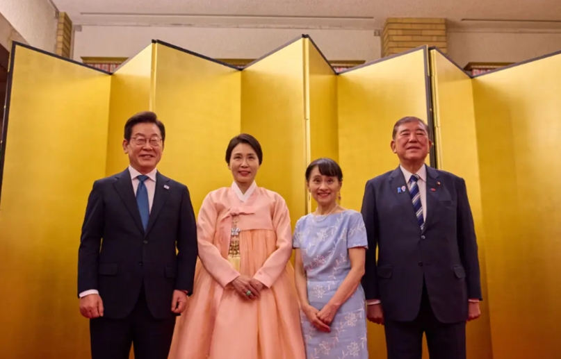 图中四人是李在明和夫人金惠景、石破茂和夫人石破佳子,两位女性颜值均是上佳。