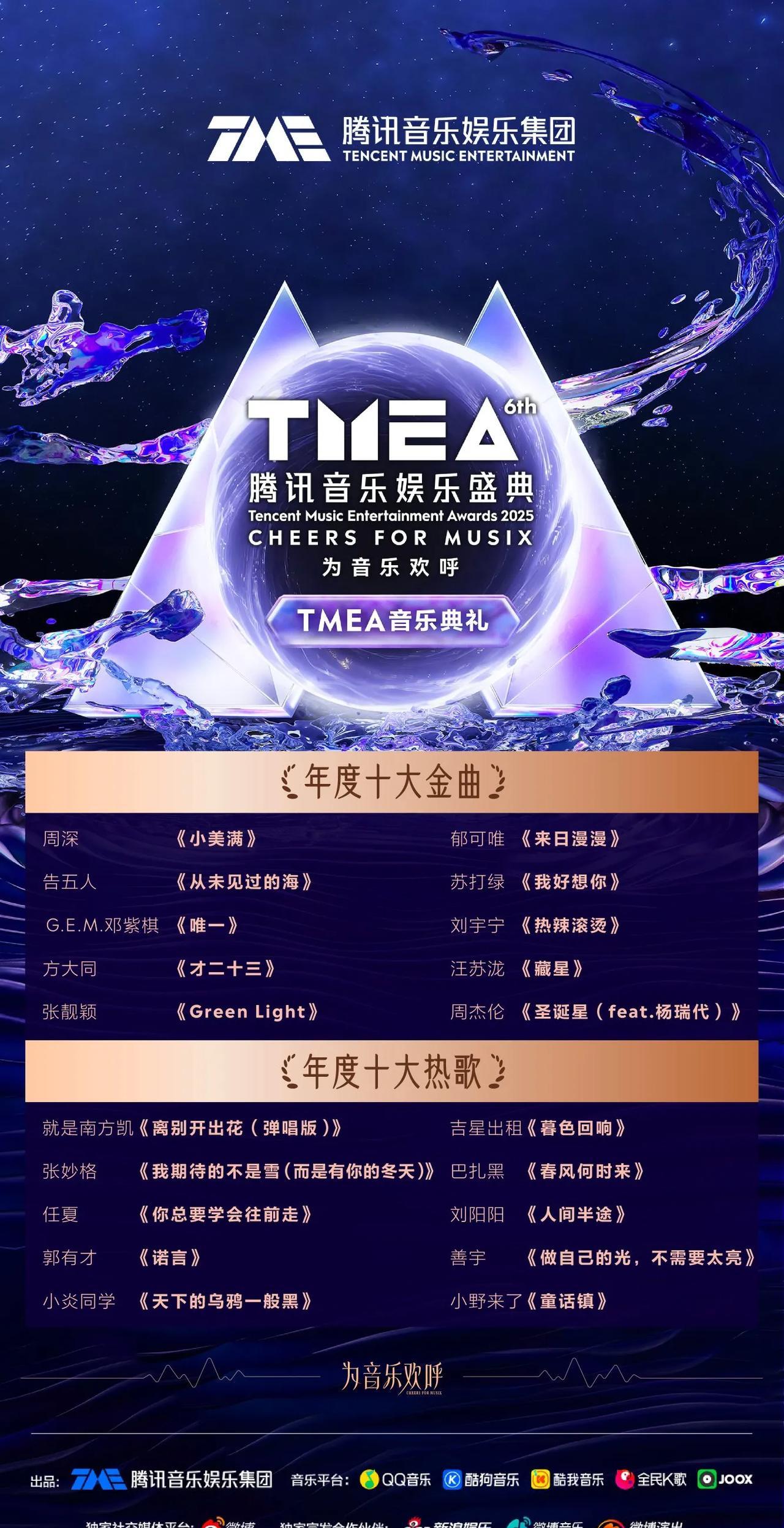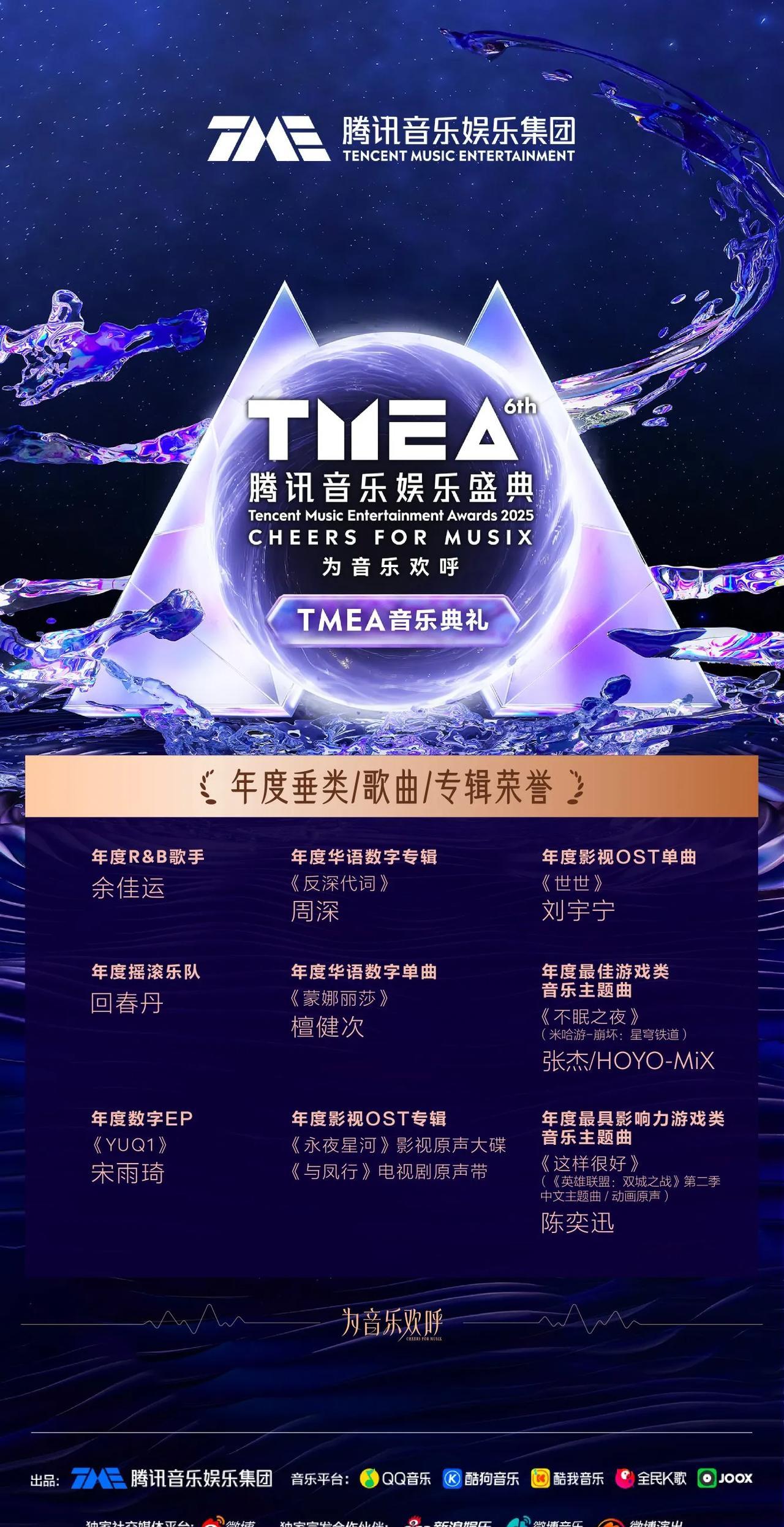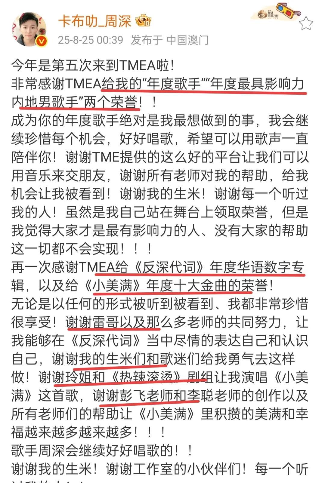 周深昨晚TEMA盛典有四个奖! 年度歌手周深 年度华语数字专辑《反深代词》 年