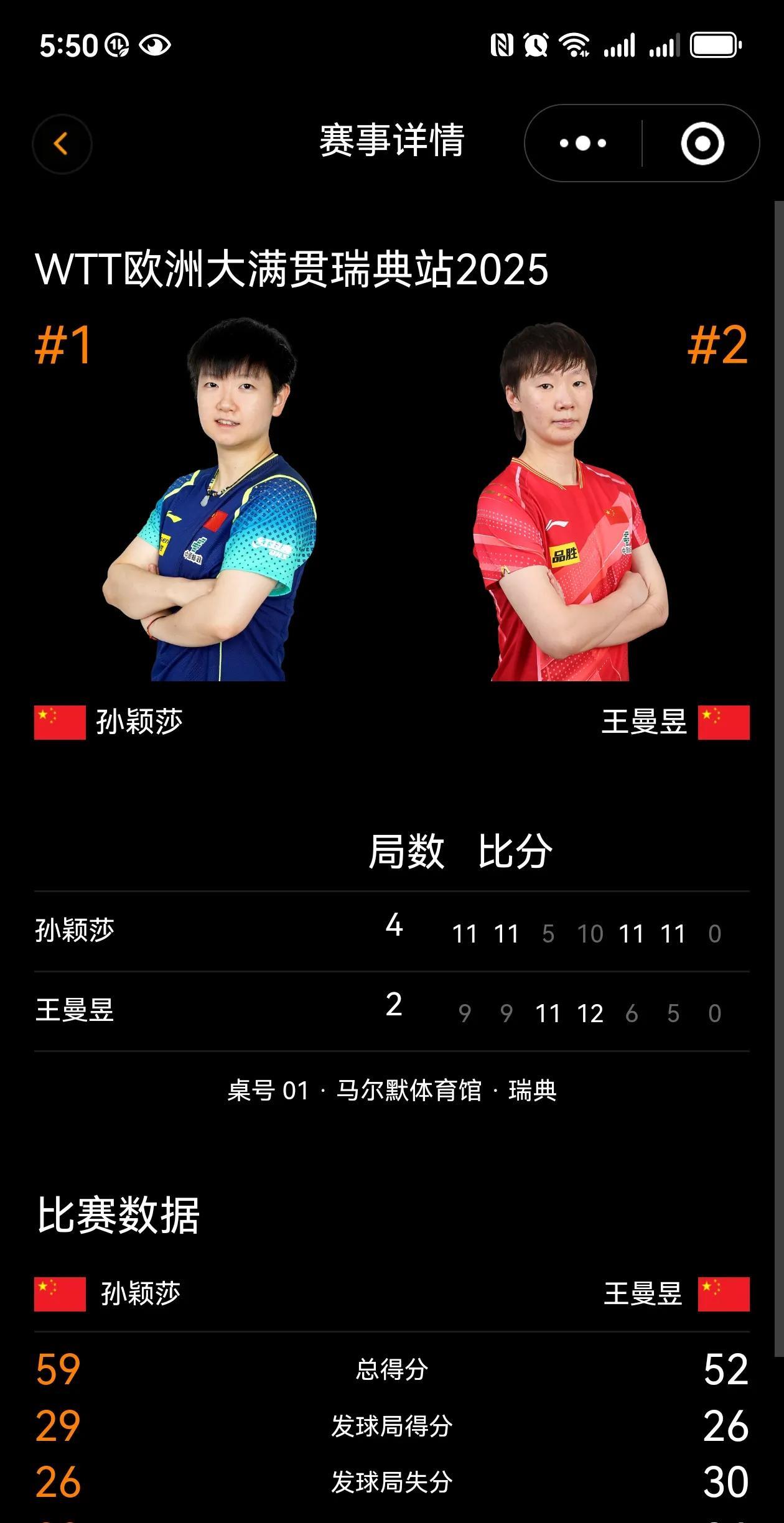 WTT欧洲大满贯瑞典站(8.14-24)当地时间24日:孙颖莎4:2王曼昱获得女