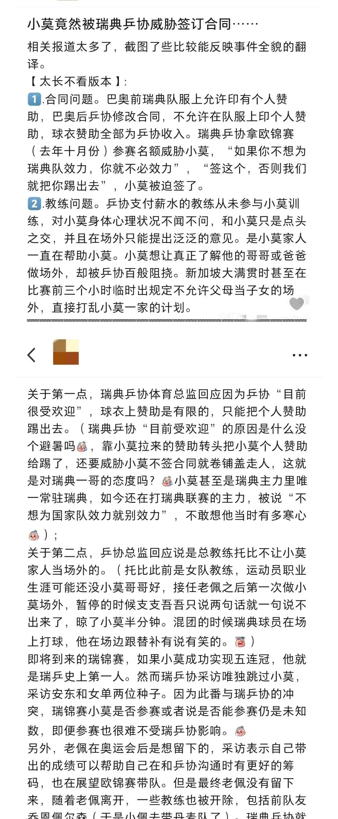 瑞典大满贯结束了,这场比赛我刚刚才看上,惊讶于小莫想要在主场赢下来的决心和渴望,也遗憾于林诗栋艰难地逆转西蒙高茨之后,没能完成最后的加冕。 小莫拿到冠军,我也是非常开心的! 他在自己家门口奉献了一场无比精彩的表现,成为大满贯赛事以来唯一一位外协冠军,他配得上这份荣耀。 赛后小莫喜极而泣,他哽咽着说这是我人生中至美好的一周,我难以置信…… 很令人动容。 我们球迷看到的只是输赢,运动员的艰难他自己、他的家人和教练才知道。 巴黎奥运会后,小莫的功勋教练老帅佩尔森去了沙特,因为赞助的问题,小莫也与瑞协发生了重大冲突,失去了集体的庇护。 由于巴黎之后他人气大涨,吸引了赞助商蜂拥而至。 但球衣上能出现的赞助是有限的,所以瑞协把小莫的个人赞助踢了出去,损害了他本人的利益,并拒绝小莫希望自己家人来当场外的要求,用参赛资格来逼迫他签订不平等的合约。 也许吧,各国有各国的樊振东。 只是因为小莫和樊振东的巴黎太耀眼,所以我们才能看到他们背后的故事。 各国乒协,他们本应是自己当家球星的坚实后盾,却因为利益、因为短视,手握生杀予夺之权成为优秀球员前进路上的阻碍,让他们在人为的漩涡中挣扎。 所以从这个角度来说,我是非常希望小莫能赢下来的。 他需要家门口这个冠军的荣耀,他需要向团体去证明自己,他需要这2000积分,他更需要这笔10万美元的单打冠军奖金。 打到这个份儿上的运动员,他们本不该再为wtt的参赛费用而感到压力的。 以前我也写过,小莫绝对是大赛型选手。 只要他想赢,他就可以发挥到极致,像一匹脱缰的野马很难摁住,这样的选手是很可怕的。 21年休斯顿世乒赛,小莫以黑马之姿从张本、雨果、波尔、林昀儒这样高手如林的半区杀出来,一路奔袭进入决赛,是樊振东摁住了他! 那一年,他才19岁,就拿到了三大赛里世乒赛的银牌。 24年巴黎奥运会,他再次以黑马的姿态出现,在32强赛,他爆冷战胜我们世排第一的王楚钦,一时间举国惊愕。 半决赛,小莫踩着当时世排第5的雨果再次见到樊振东,其中有一局,小莫在雨果10-4的巨大优势下,连得8分逆转雨果。 决赛,也是樊振东摁住了他。 今天的这场瑞典大满贯决赛,让我看到了小莫那种坚定的决心和对胜利强烈的渴望。 也让我再次相信,巴黎奥运会他能战胜王楚钦,绝不是拍子问题或是没休息好什么的,只要他非常想赢,他就真的有可能把任何一个人从高位拉下马。 小石头还需要千锤百炼,在无数次的摔打、甚至失败中成长和蜕变,才有可能成就自己的传说。 再次祝贺小莫!