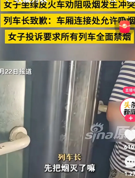 绿皮火车到底该不该禁烟? 女子绿皮火车劝阻他人抽烟,并用手机拍摄抽烟男子新发冲突!列车长表示:车厢的连接处可以抽烟!女子投诉要求所有列车禁止抽烟! 我也不吸烟,讨厌有人在身边抽烟,但是只要不是禁烟场合我从来不禁止别人抽烟,抽烟是别人的自由,你可以选择躲远点,有什么资格管别人?高铁是禁烟的,你可以选择高铁出行! 为什么坐绿皮车?有的人坐绿皮车就是为了可以喝酒,抽烟,打哈哈,这有问题吗?你还投诉要求所以列车禁烟,你好大的面子哦!