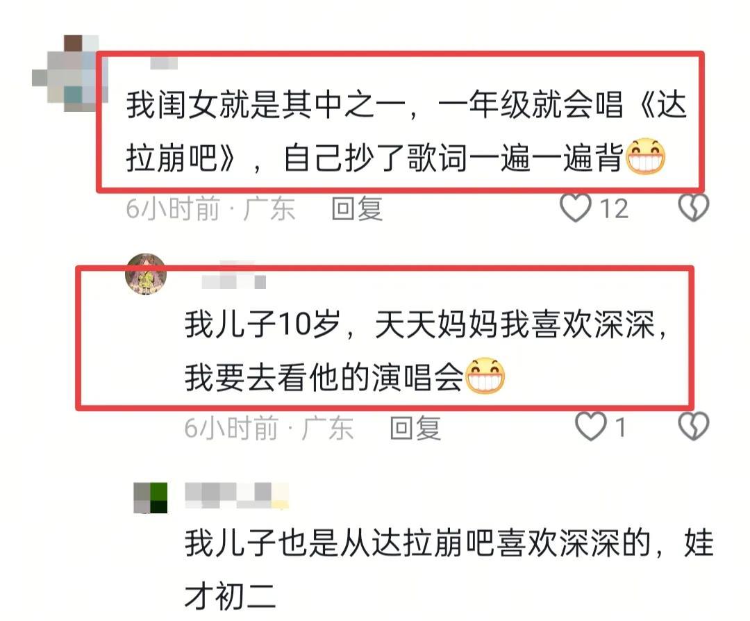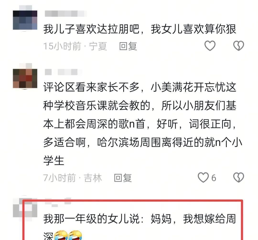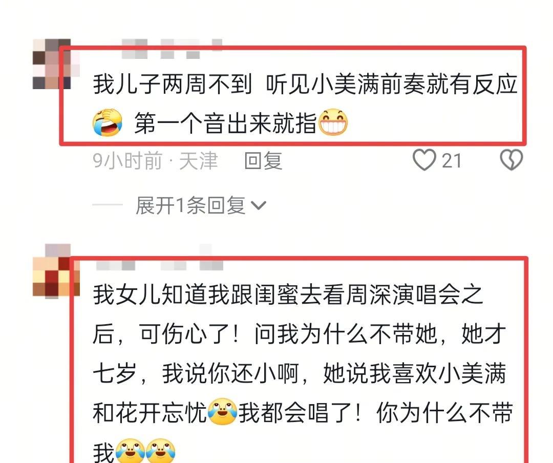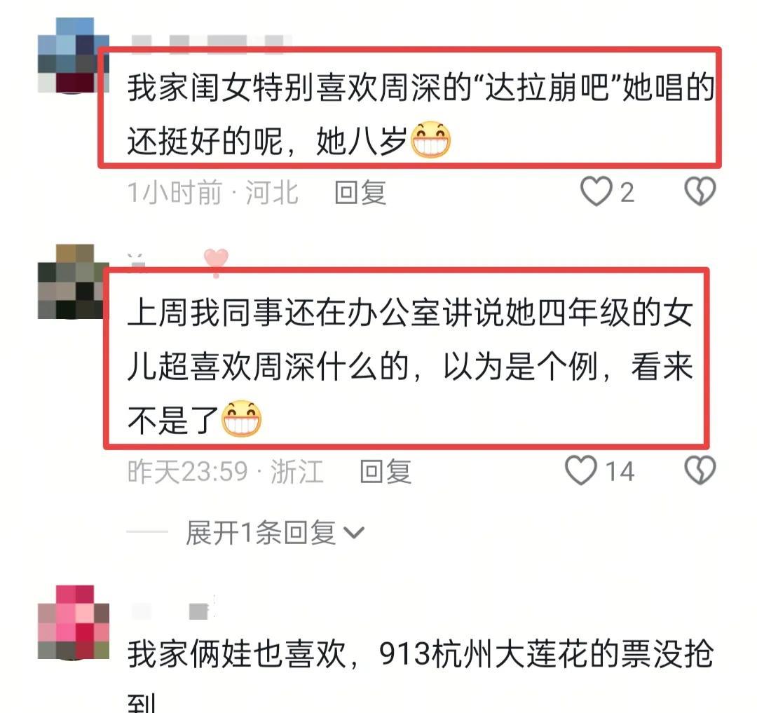 周深的粉丝上到没牙,下到没牙! 周深的粉丝是上到九十九下到啃手指,歌声人品和三高(唱商高,情商高,智商高),都是值得欣赏和学习的榜样! 所以是全年龄段的[呲牙] 暑假演唱会上的小朋友也是特别多,而且他们都很会唱周深的歌,比如《小美满》《达拉崩吧》《璀璨冒险人》都可以整首跟唱的![鼓掌]