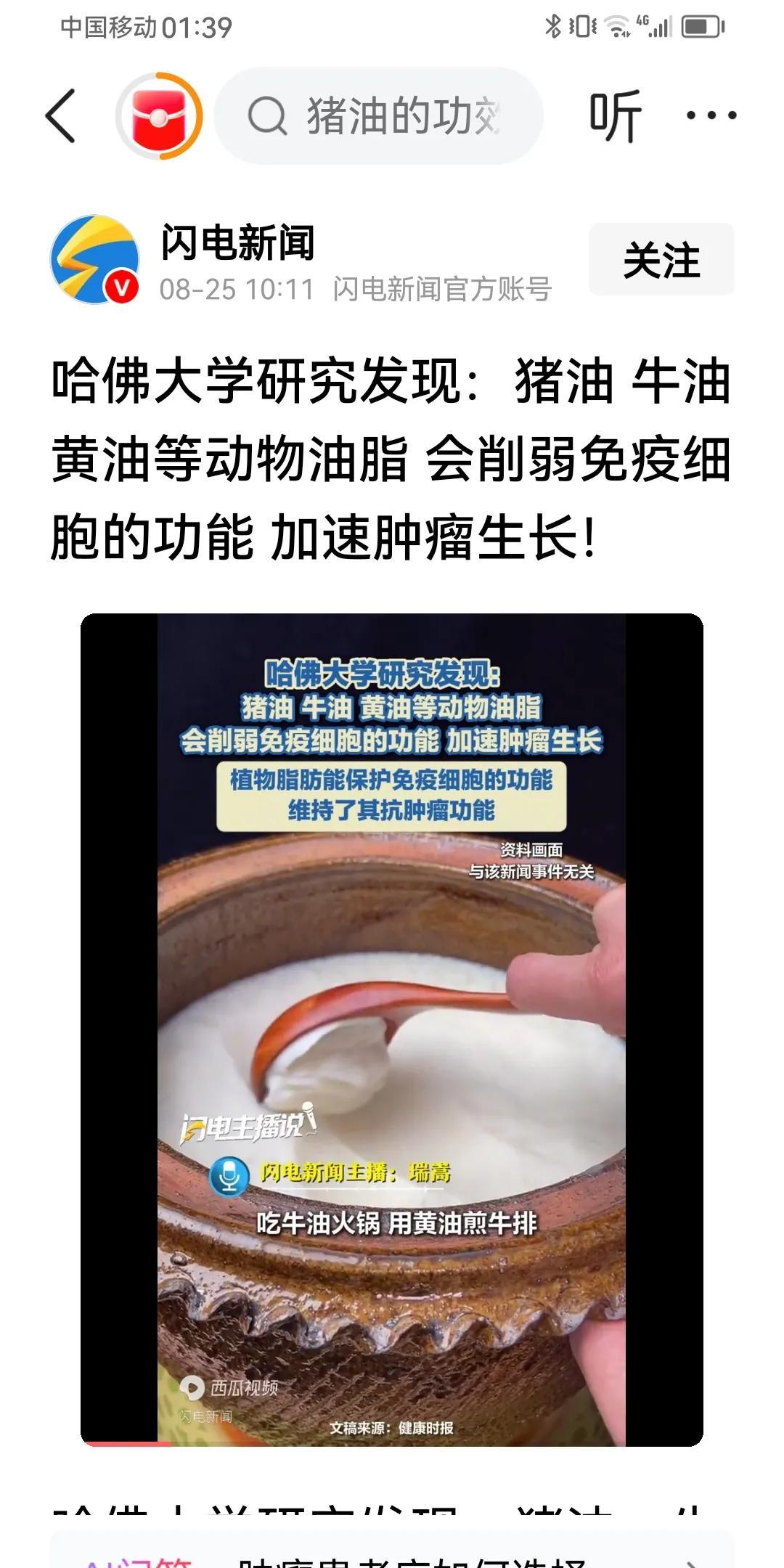 哈佛大学研究发现:猪油牛油黄油等动物油脂会削弱免疫细胞的功能加速肿瘤生长