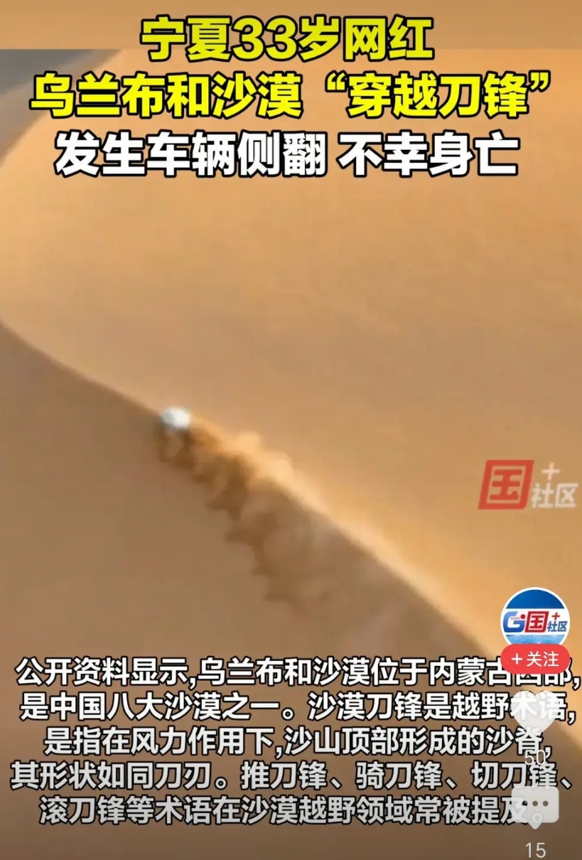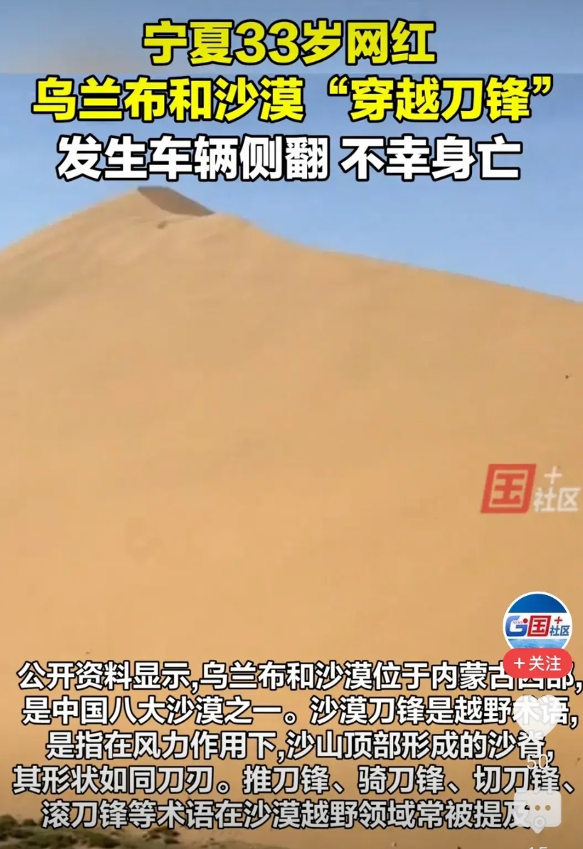 宁夏33岁网红(张某)为寻求刺激,开车穿越沙漠刀锋,中途车子侧翻,张某当场身亡。