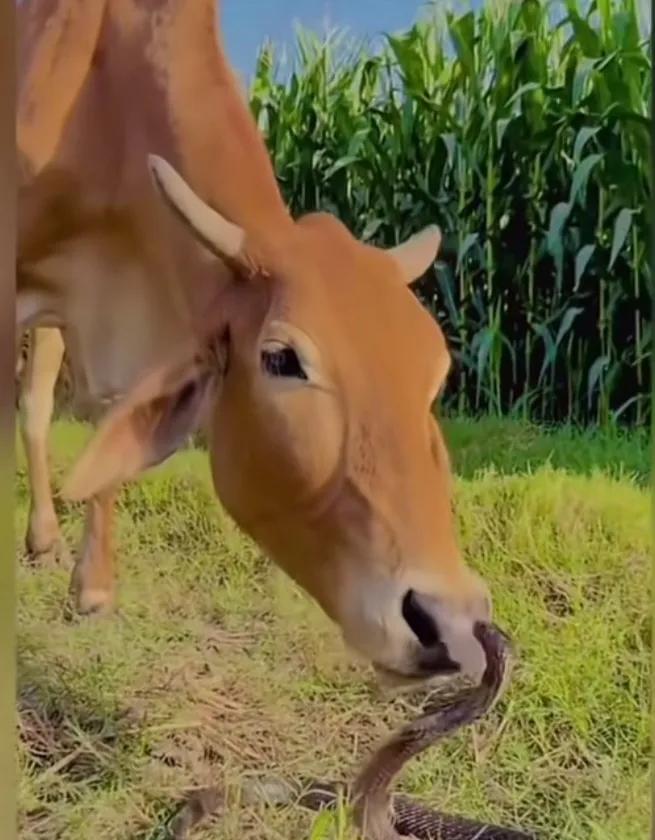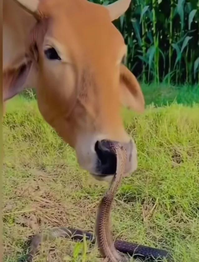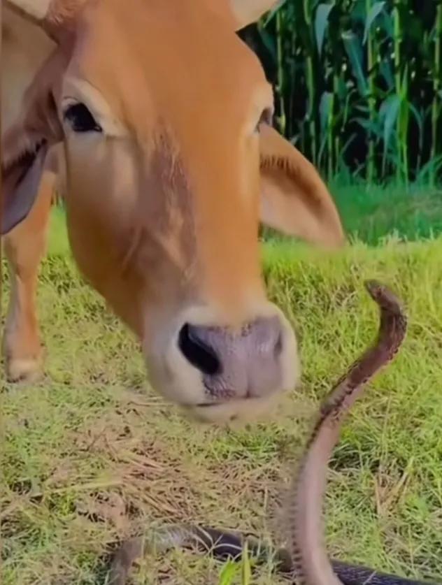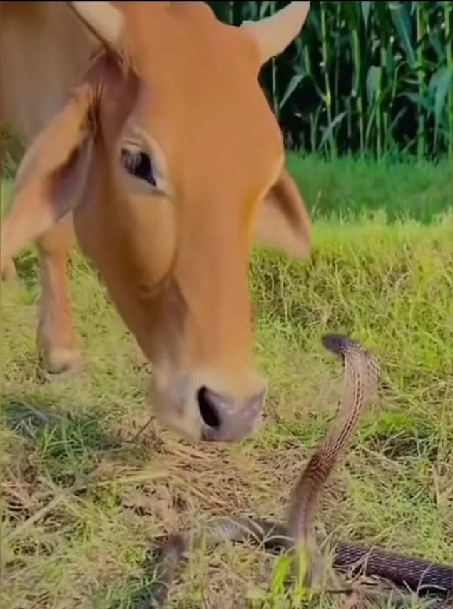 在草地上面一头黄牛正在吃草,突然抬头看到旁边有一条眼镜蛇,正虎视眈眈的盯着它,黄牛走上前去,对着眼镜蛇的头就是一顿舔,眼镜蛇不断的向后避让,黄牛更加得步进尺,又上前一步,继续舔眼镜蛇,眼镜蛇被黄牛搞蒙了,心想这黄牛是不是在找死?竟然不怕我这剧毒蛇,还一个劲的上前舔我,搞得我满脸都是唾沫。[捂脸]