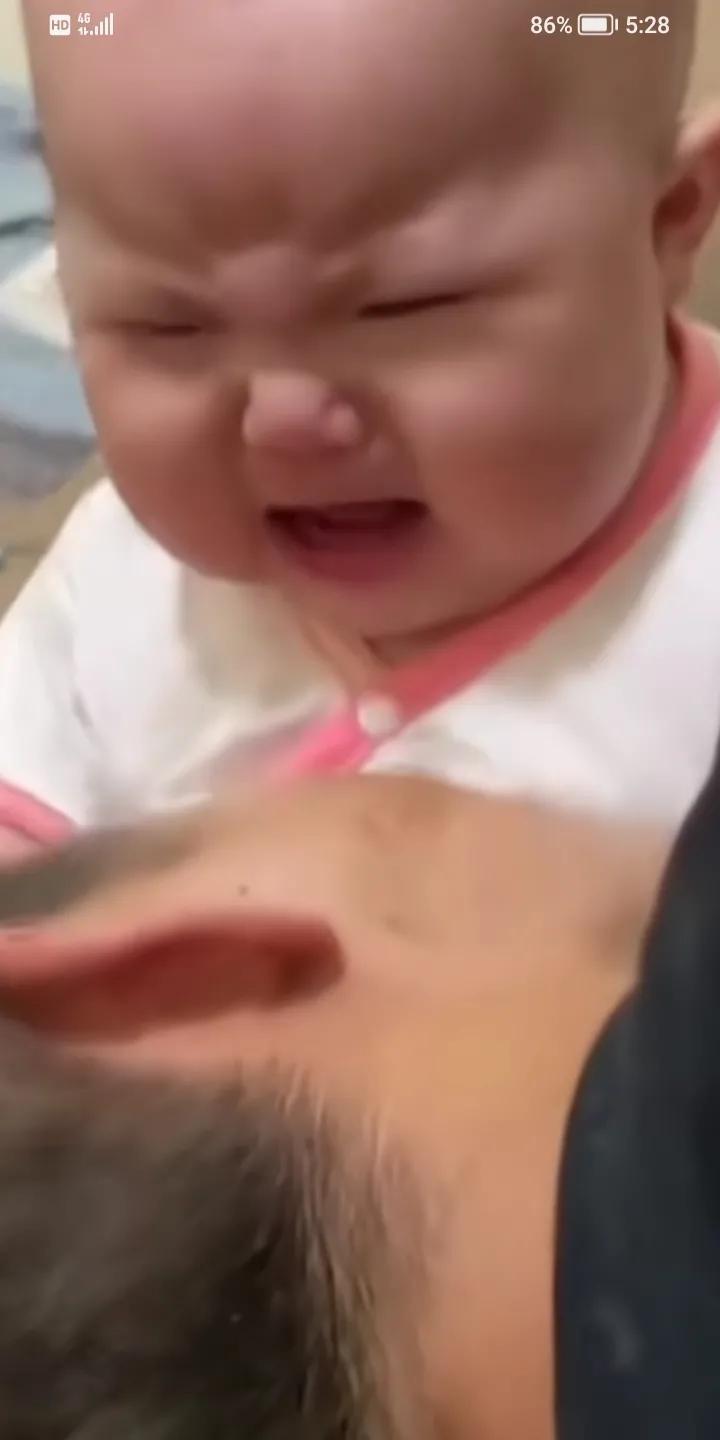爸爸惹宝宝了,宝宝生气了,照着爸爸的脸狠狠咬了一口,爸爸脸上立马一个嘴印,网友笑了说:气势是有,咬是咬了,吃了没牙的亏。