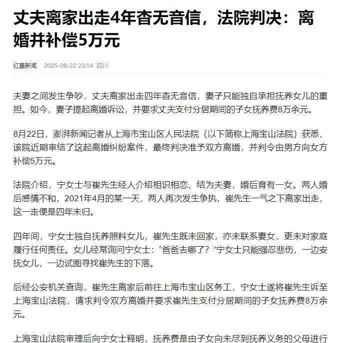 心太狠了!上海,一男子和妻子吵架后,因赌气选择离家出走,4年来杳无音讯,妻子只能独自承担养育孩子的重任,直到在警方的帮助下,才找到了男子,于是就将他告上法庭,要求离婚并索要8万元抚养费,而法院这样判了! 据红星新闻8月22日报道,在上海,一场夫妻间的争吵,竟然让一个家庭四分五裂,男子一气之下离家出走,留下妻子独自抚养孩子,四年后,妻子终于找到他,愤怒地将他告上法庭,要求离婚并索赔。 事情要从四年前说起,这对夫妻结婚没多久,感情就出了问题,经常因为鸡毛蒜皮的小事吵得不可开交。 妻子说,男子脾气火爆,动不动就摔东西,吵完架还不爱沟通,总是冷战,她尝试过好好谈,但每次都像对牛弹琴,问题越积越多。 终于,在一次激烈的争吵后,男子撂下一句“我受够了”,收拾了几件衣服,头也不回地走了,妻子当时以为他只是出去冷静几天,没想到这一走就是四年,杳无音讯。 妻子回忆那段时间,简直像噩梦,家里还有个年幼的孩子嗷嗷待哺,丈夫突然失踪,留下的只有一堆账单和生活的重担。 她一个人既要上班挣钱,又要照顾孩子,常常忙到半夜才能喘口气,孩子生病时,她独自抱着孩子跑医院;孩子问“爸爸去哪儿了”,她只能强忍泪水,编个理由搪塞过去。 妻子说,她最怕的是孩子长大后,觉得爸爸不要他了,这种心酸没人能懂,为了找到丈夫,妻子试过各种办法。 她先是问遍了男子的亲戚朋友,可没人知道他的下落,她甚至跑到他常去的棋牌室、老家的小村子找线索,但每次都失望而归。 有人劝她:“他可能早就不要这个家了,你就当他死了,往前看吧。” 可妻子不甘心,她觉得就算要离婚,也得当面把话说清楚,不能让孩子一辈子没个交代, 四年里,妻子一边咬牙撑着这个家,一边四处打听丈夫的消息。 直到今年,她听说警方有个寻人系统,抱着试试看的心态报了案,没想到,警方效率很高,很快查到男子这几年一直在上海一家工厂打工,过着跟家里完全隔绝的生活。 得知消息后,妻子既愤怒又无奈,她立刻请了律师,准备起诉离婚,她不仅要结束这段名存实亡的婚姻,还要为这四年的辛苦讨个公道。 在法庭上,妻子的诉求很明确:离婚,还要男子赔偿她这些年独自抚养孩子的损失,她提出8万元的抚养费,觉得这点钱远远不够弥补她的付出。 男子却辩解说,他离家出走是因为夫妻感情破裂,生活压力太大,他一时冲动才走了,他承认没尽到父亲的责任,但也说自己这些年在外打工,收入微薄,根本拿不出那么多钱。 法院听完双方的陈述,仔细梳理了案情,法官解释说,按照法律,抚养费通常是由未成年子女向父母主张的,夫妻之间并不能直接索要“抚养费”。 不过,妻子可以要求离婚时的经济补偿,因为她在男子离家期间,独自承担了家庭和孩子的全部开支,付出了巨大的心血。 法官还了解到,男子这几年虽然收入不高,但也没有主动联系过妻子,更别提给家里寄钱了,反观妻子,不仅要工作养家,还要兼顾孩子的教育和生活,确实承受了不公平的负担。 经过调解,法院最终判决:准许两人离婚,男子需一次性支付妻子5万元作为经济补偿,这笔钱虽然比妻子要求的8万元少,但她觉得至少给了孩子一个交代,也算对这四年苦日子的补偿。 男子也同意了判决,说自己确实有错在先,愿意承担后果,庭审结束后,妻子走出法庭,长舒了一口气。 她说,这段婚姻早就该结束了,拿到的补偿虽然不多,但至少能让孩子的生活好一点,这场离婚案在网上传开后,网友们议论纷纷。 有人为妻子抱不平:“这男的也太不负责任了,扔下老婆孩子跑了四年,5万块就打发了?” 也有人觉得男子有苦衷:“夫妻吵架,两个人都有问题,他可能也是被生活逼得没办法。” 还有网友感叹:“单亲妈妈太不容易了,孩子还那么小,她是怎么撑过来的?” 这起案件让人唏嘘,也戳中了很多人的痛点,婚姻里,争吵在所难免,但用离家出走来逃避问题,只会让矛盾越积越深,最终伤害的不仅是夫妻双方,还有无辜的孩子。 法院的判决虽然给了妻子一些补偿,但四年的心酸和付出,又岂是5万元能衡量的?妻子在接受采访时说,她现在只想带着孩子好好生活,未来再也不想被这样的婚姻拖累。 这起案件的意义,不仅仅在于判决结果,更在于它提醒我们:婚姻不是儿戏,责任不能随意甩锅,无论是丈夫还是妻子,都得为家庭和孩子担起应有的责任,逃避只能让问题更糟,面对和沟通才是解决之道。 信源:红星新闻2025-08-22——丈夫离家出走4年杳无音信,法院判决:离婚并补偿5万元