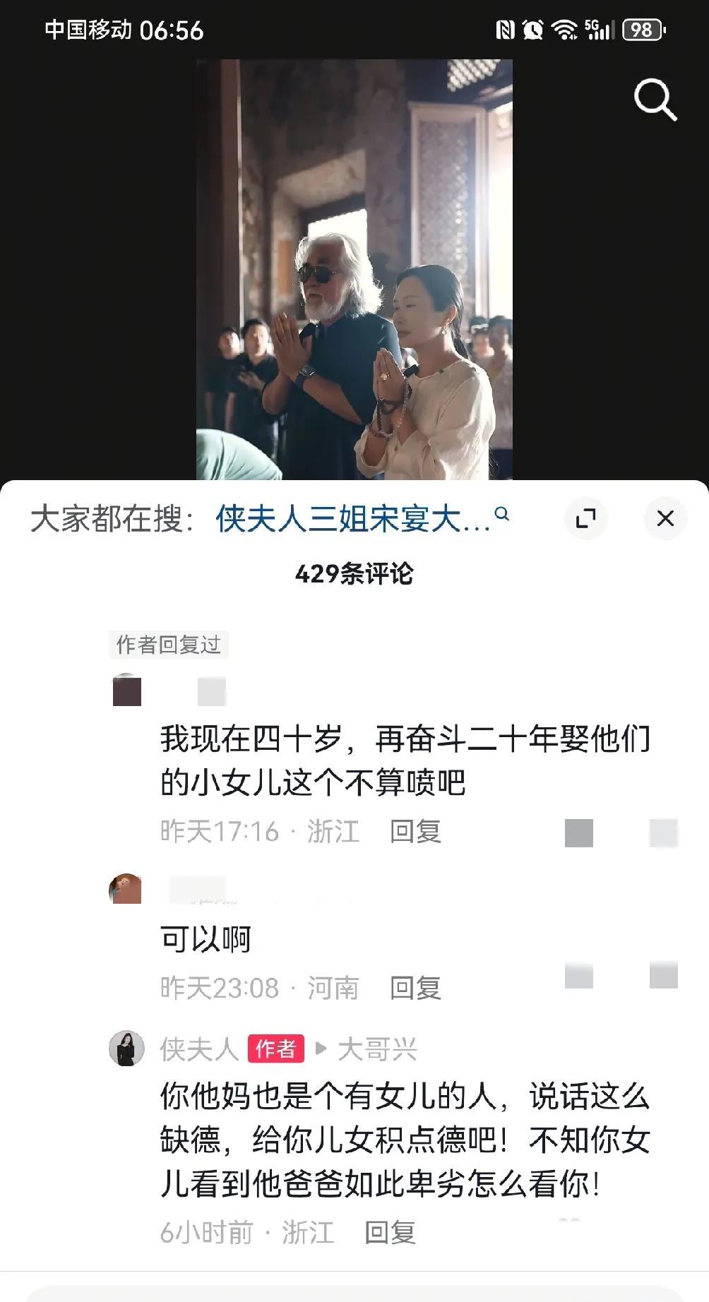 张纪中老婆杜星霖在抖音上大破防了! 张纪中老婆杜星霖在抖音上发了一条与张纪中去寺庙上香拜佛的视频,评论区有一个人评论说:“我现在40岁,再奋斗二十年娶他们家的小女儿不算喷吧?” 此人虽然是带着点调侃的低俗玩笑,但偏偏他此话戳中了杜星霖某些痛点,让她瞬间破防的大骂对方让对方积点德,还说你如此卑劣让你女儿怎么看你。 从杜星霖的破防中可以看出,她虽然与张纪中的年龄差31岁,但内心里其实并不赞同以后自己的女儿像她这个母亲一样找大许多的伴侣,所以她才会在对方的调侃中气得忘记保持体面。 杜星霖与张纪中的结合,让大多数人都潜意识里认为她是冲着张纪中的资产去的,不然凭借杜星霖的颜值和学历,是肯定不会选择大自己31岁的老男人的,面对着质疑,杜星霖在许多场合都不遗余力的向大众传递,他与张纪中结婚,纯粹是仰慕张纪中的才华,是爱着张纪中这个人,不是为了他背后的财产。 可惜,不论杜星霖解释了多少次,立了多少人设,大家依旧不怎么相信她! #我的宝藏兴趣#