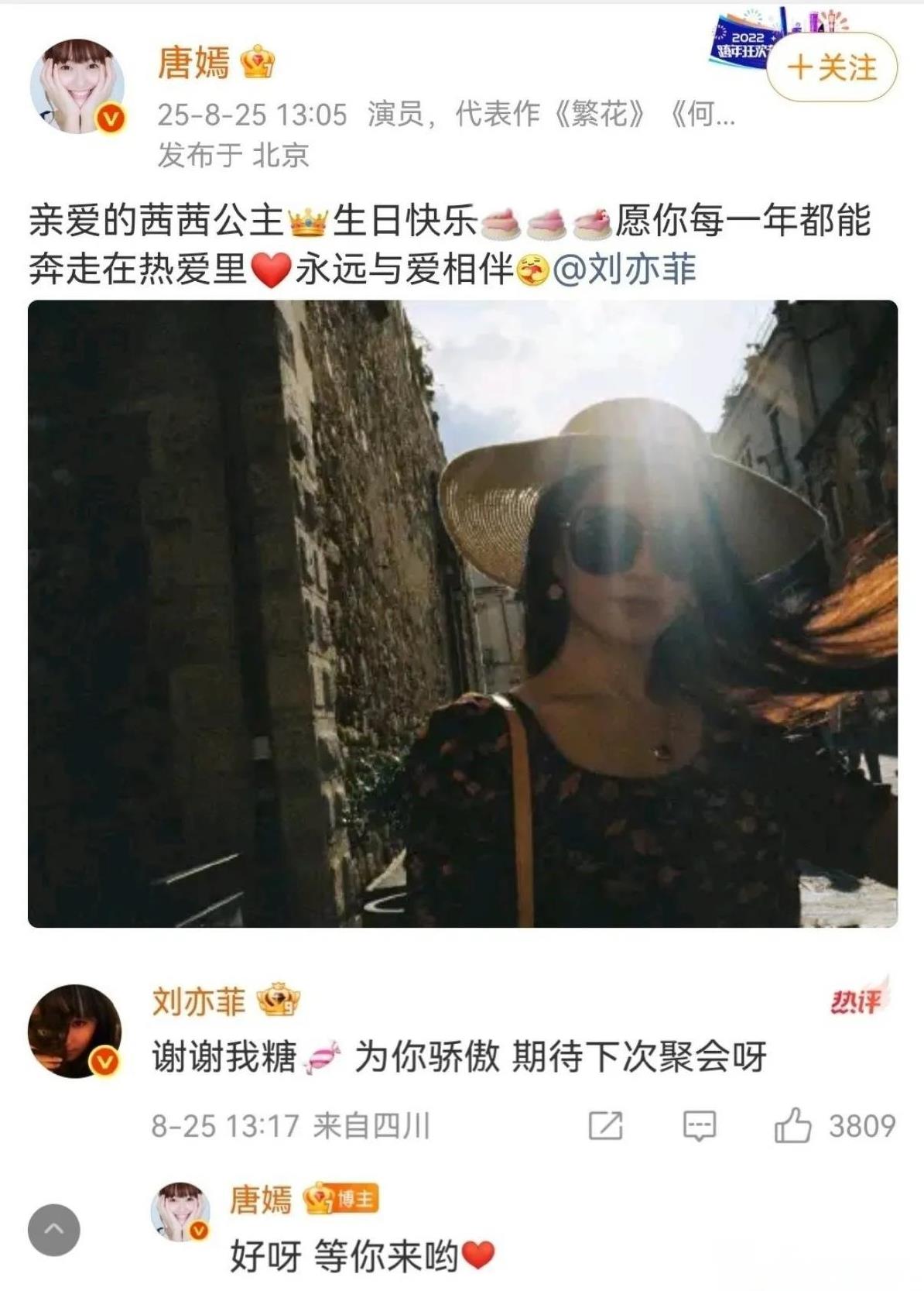 今天刘亦菲迎来38岁生日! 好闺蜜唐嫣准时送上祝福: “亲爱的茜茜公主,生日快乐, 愿你每一年都能奔走在自己的热爱里, 永远有爱相伴。” 刘亦菲也暖心回复:“期待下次聚会!” 你知道吗? 这已经是唐嫣连续第11年为刘亦菲庆生了! 这样始终如一的真挚情谊,实在让人羡慕。 尤其在纷繁复杂的娱乐圈中, 翻脸、疏离本是常态, 而她们却始终如一股清流, 温柔坚定地陪伴彼此。 愿她们友谊长存,一直美好下去!