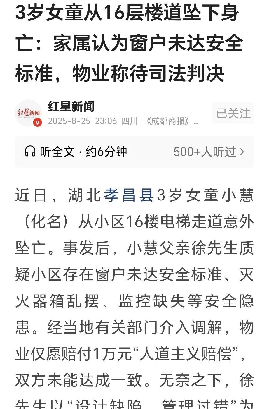 湖北孝昌,一3岁女童住16楼,妈妈下楼扔垃圾,女童不见妈妈,开门寻找,爬上电梯侧边窗户,瞬间跌落死亡,家长痛不欲生,一看窗户低矮,只有90cm,窗扇平开90°,没防护拦,也没限位器,更没有贴安全警示标识,物业提出,赔家属10000元,家属不愿意,以设计缺陷、管理过错为由,将开发商、设计方、物业公司告到法院,索赔518322.25 元,物业: 等判决! 徐先生和妻子育有一女,女儿小慧年方3岁,徐先生上班,妻子在家照顾女儿。 2025年7月8日,上午8:30分左右,徐先生的妻子收拾房间,打扫完毕将垃圾收拾到一起。 她安顿好小慧,要她独自玩耍,徐先生妻子打开门下楼扔垃圾。 妻子心想,下楼扔垃圾也就10分钟,她快去快回,小慧在家里玩耍一会,应该不会有啥问题。 谁知小慧一刻也离不开母亲,母亲刚走,小慧就四处寻找,走遍屋子,看不见母亲。 小慧急了,跌跌撞撞走到入户门口,她打开大门走了出去。 门口电梯门紧闭,电梯按钮高1.2米,小慧身高92cm,够不到电梯的按钮。 电梯一侧装有窗户,窗户很大,离地面只有90cm。 窗户下面搁置了一个60cm的灭火器箱,箱子上未张贴任何安全警示标志,小慧懵懂无知,她爬上箱子,又爬上了窗子。 窗子窗扇可以外开90°,没装防护栏,也没装置任何限位装置。 小慧年幼,不知危险,她爬上灭火器箱,又爬上窗户,以为到了窗外就能找到妈妈。 谁知她脚下一滑,瞬间从窗口坠落下去。 只听见一声巨响,小慧从天而降,砸在一楼停放的一辆车顶,车辆天窗被砸烂。 一楼开了一家超市,老板听到动静,赶紧跑到到门外一看,顿时被吓得大叫起来! 老板报警,警方赶来,发现小慧是意外从16楼跌落,不属于刑事案件。 医务人员赶到,发现小慧已经死亡,警方经调查后确认,小慧属于非正常死亡。 徐先生接到通知,第一时间赶了回来,妻子肝肠寸断,哭的扑天抢地。 徐先生心疼不已,但楼道里并没有监控,无法看到小慧的活动轨迹,只能从外部监控看到小慧坠楼时的情况。 徐先生一眼看到电梯按钮,按钮高1.2米,不是女儿能够着的距离。 他又转眼往电梯一侧看去,顿时看到那个低矮的窗户和那个小灭火器箱子,心里顿时出现了一个画面。 小慧小小的身体,够不着电梯按钮,只能够着那个灭火器箱和窗户台子。 顿时之间,他知道小慧为啥能跌落下去了,徐先生向物业提出质疑,窗户低矮未装防护栏,灭火器箱子胡乱搁置,楼道未装监控等安全隐患…… 经过协商,物业表示,愿意拿出10000元作为人道主义赔偿。 徐先生火冒三丈,孩子虽小,也是一条鲜活生命,难道只值这一万元? 徐先生在楼道里走上走下,发现整栋楼的电梯走道窗户均能向外90度打开。 而且窗户上都没有安装防护栏和限位器,灭火器箱随处摆放,并没有统一摆放地点,毫无规范可言。 走道里没有安装监控,看不到孩子出门后的活动轨迹。 夫妻两人痛不欲生,小慧本该在9月1日这天上幼儿园的,如今斯人已逝,令人痛断肝肠。 徐先生认为,楼梯间设计的窗户台过低、只有90cm,往外平开,未装防护,都是开发商和设计方设计有问题。 另外,物业公司随意放置灭火器箱,未张贴安全标志,未协助做好窗户防护措施。 因此,徐先生告到法院,以设计缺陷和管理过错,要求开发商,设计方和物业公司三方共同赔偿518322.25元。 物业则表示,等待开庭审理,一切以判决为准。 那么,这件事在法律上是怎么认定的呢? 《民法典》第800条规定: 勘察、设计的质量不符合要求或者未按照期限提交勘察、设计文件拖延工期,造成发包人损失的,勘察人、设计人应当继续完善勘察、设计,减收或者免收勘察、设计费并赔偿损失。 《民用建筑设计统一标准》规定,居住建筑临空外窗的窗台距楼地面净高不得低于0.9m,否则应设置防护设施。 防护设施的高度由地面起算不应低于0.9m,而该小区电梯侧窗户高90cm,未安装防护栏或限位装置,存在明显设计缺陷,不符合安全标准。 若经认定,该设计缺陷与女童坠亡有直接因果关系,开发商和设计方应承担相应的赔偿责任。 《民法典》第942条规定: 物业服务人应当按照约定和物业的使用性质,妥善维修、养护、清洁、经营管理物业服务区域内的业主共有部分,维护物业服务区域内的基本秩序,采取合理措施保护业主的人身、财产安全。 对物业服务区域内违反治安、环保、消防等法律法规的行为,物业服务人应当及时采取合理措施制止、向相关部门报告并协助处理。 物业公司未为窗户加装限位器、未张贴安全警示标识,且灭火器箱随意摆放,未履行好安全保障和管理义务,对事故的发生存在过错,应当承担相应的责任。 目前,物业回应,等待法院判决结果。 该案将在9月3日开庭审理。 对此,你怎么看?欢迎评论区留言讨论。 关注@王哥说法 #头号创作者激励计划#