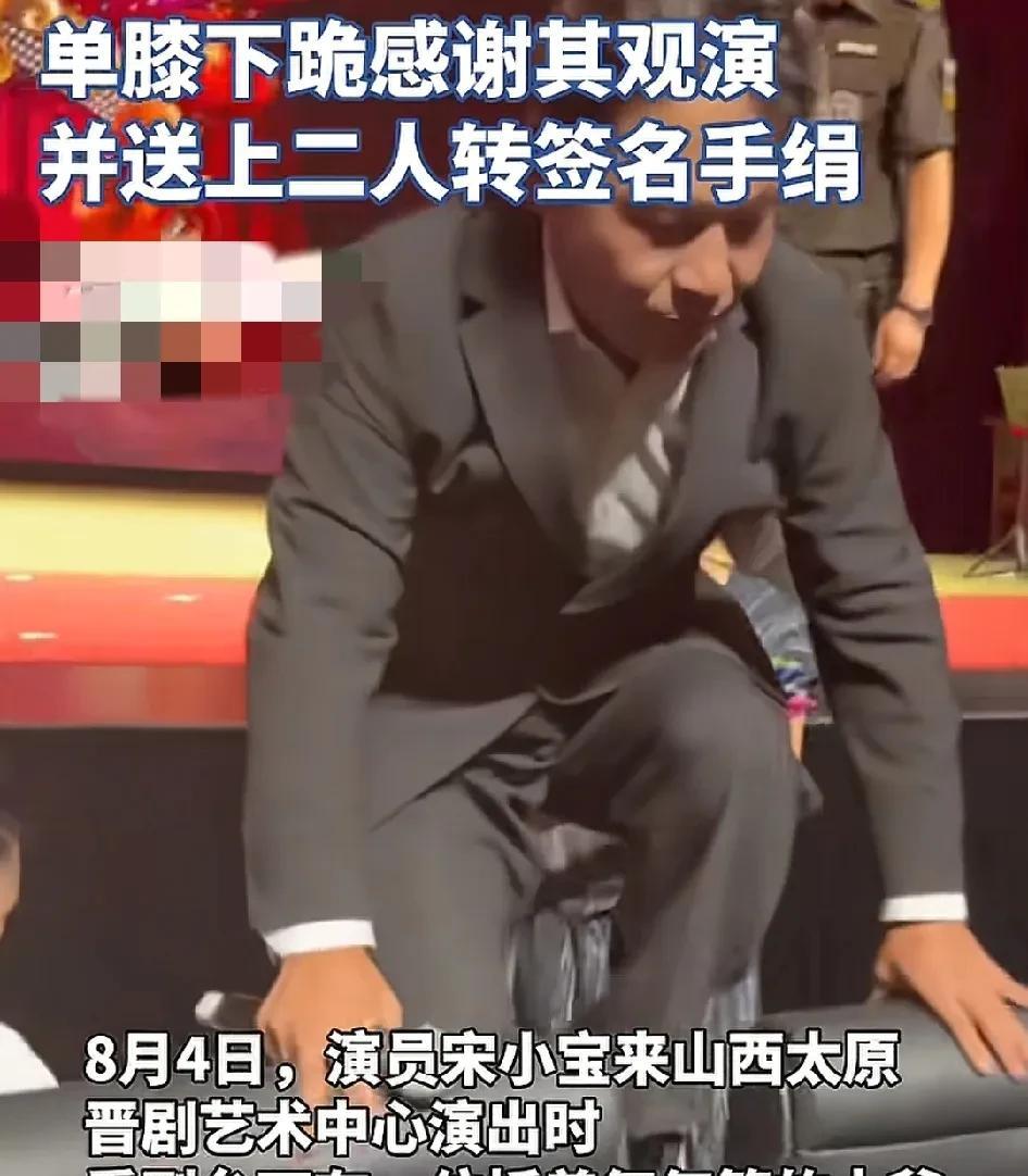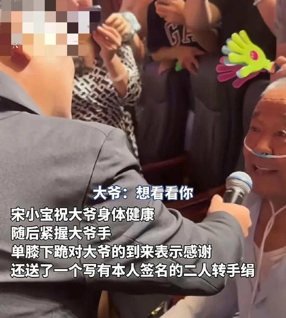 宋小宝在太原演出是,看到台下有一名头发全白插着氧气管来看他的大爷,他立刻激动的从台上跳下来,连续过好几排椅子跑到大爷面前,给大爷行了一个半跪礼,感谢大爷都生病了还来看他。 大爷看到宋小宝公开也非常开心,握着宋小宝的手,眼里全都是看见偶像的惊喜。 网友们看到这一幕后,都十分佩服这个大爷,插着氧气管去看宋小宝的演出,这得多喜欢宋小宝啊,比很多年轻人追星还要疯狂。 不过宋小宝在中老年人群中,的确是很受追捧的偶像,他的喜剧作品是不少中老年人在家无聊解闷的乐子。 宋小宝对此也很感动,他和大爷说话的时候,都带点哭腔了,对大爷行的半跪礼也是真心实意的,他真心希望大爷能身体健康长命百岁。 小编还在宋小宝身上看到了以前老演员们的特质,以前的演员对喜欢自己的粉丝和观众都非常重视,可以说观众就是他们的衣食父母,对于喜欢自己的粉丝怀着感恩之心,比现在很多拿粉丝当韭菜割的明星强多了。