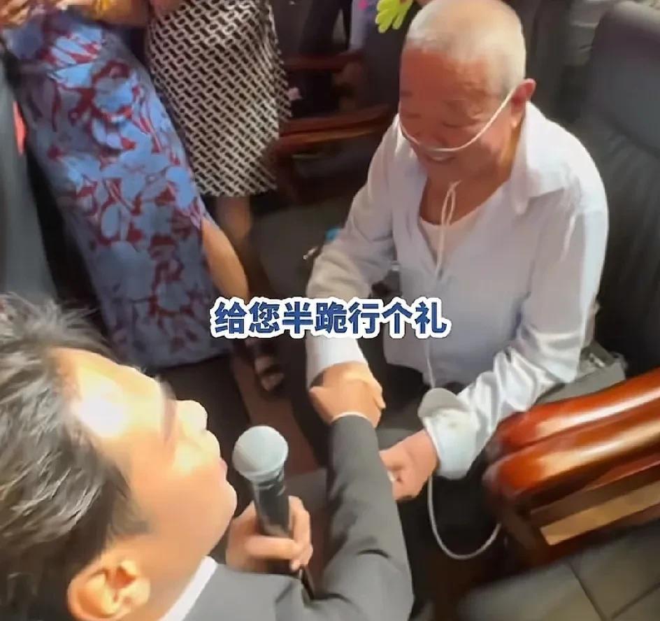 宋小宝在太原演出是,看到台下有一名头发全白插着氧气管来看他的大爷,他立刻激动的从