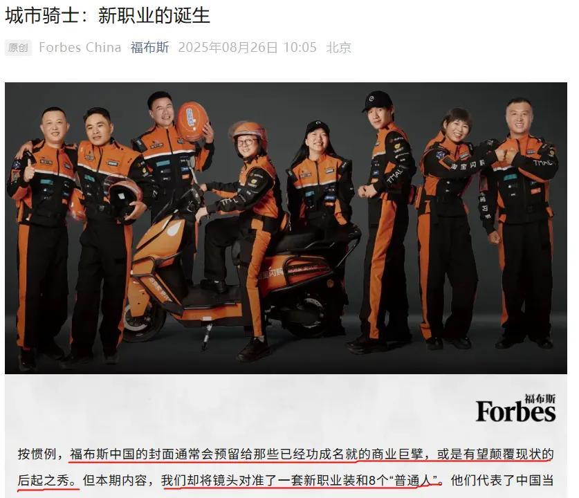 今天,和一个行业内朋友谈起城市骑士登上《福布斯》封面这件事,他的一个观点,让我非常意外! 网上传出的一条消息,淘宝闪购官宣了8位城市骑士代言人。紧接着看到这8位骑士就身着淘宝闪购新制服登上了《福布斯》杂志封面。 普通人登上福布斯封面,还是第一次见到。《福布斯》作为全球知名的商业杂志,可不是谁都能登上封面的,在过去100多年的历史中,封面人物几乎都被商业大佬、行业天才新秀所占据,将城市骑士这样的一线劳动者摆上封面还是历史首次。 这下子很多人估计想不明白,但是朋友的一番话,却点醒了梦中人。 朋友说,早就应该这样了,城市骑士这些服务者的价值总算被社会看到了。 事实上,《福布斯》也提到,这一次之所以选择城市骑士作为封面人物,是因为他们身上折射出了中国当下商业文明合作范式的新变化。随着骑士这一职业服务人群的扩散,社会、顾客、社区以及企业,对于他们的劳动价值都越来越被肯定了。 其实,城市骑士作为和城市、和人接触最多的职业之一,他们对于城市建设的贡献一直是很巨大的,像这次的8名城市骑士代言人中,就有全国劳模,甚至还有“诗人”,他们其实身上不乏闪光点。 其中骑士张文强就曾获得过全国劳动模范荣誉,他的工作,主要是负责为老年人送餐,解决那些子女不在身边的老人就餐问题。而在工作中,他也总是会热心肠的帮助有需要帮助的人,比如说拿快递、带东西等等。 或许城市骑士只是平凡的人,这一职业也只是平凡的岗位,但是做的却是不平凡的事,他们的存在,时刻在守护城市美好,他们理应站在舞台的中心,这一次是第一次,未来还会有更多次!