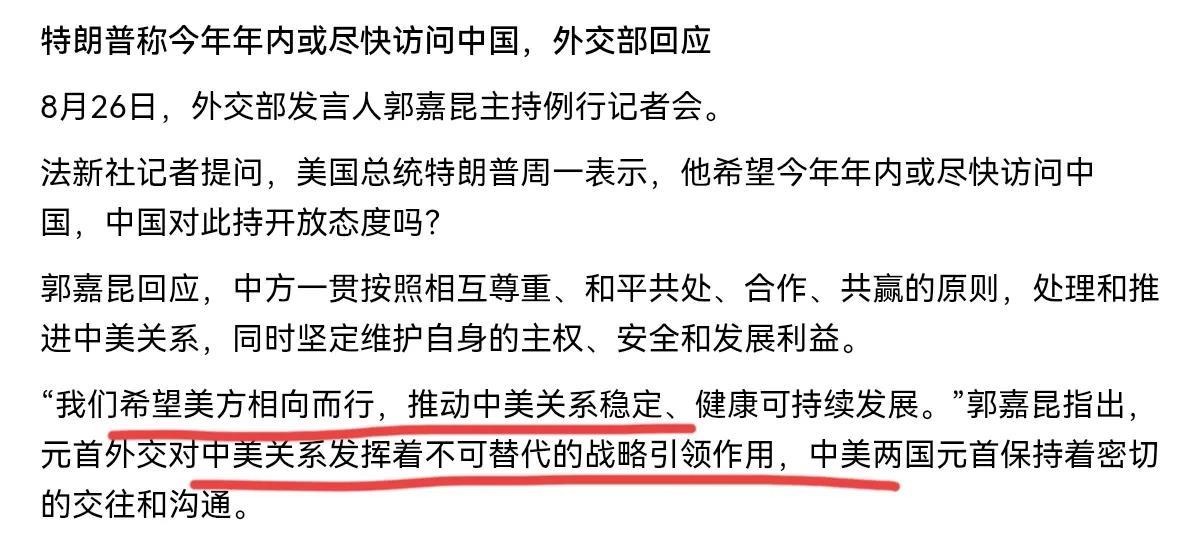 我们出来回应了,这一次我们的回应不一般!在特朗普表态称今年年内或尽快访问中国之后,我们外交部进行回应了!8月26日,我们的外交部发言人在例行记者会上表示,中方一贯按照相互尊重、和平共处、合作、共赢的原则,处理和推进中美关系,我们希望美方相向而行,推动中美关系稳定、健康可持续发展。 我们的外交部发言人表示,元首外交对中美关系发挥着不可替代的战略引领作用,中美两国元首保持着密切的交往和沟通。很显然,在特朗普表达访华意向之后,我们的外交部的回应没有否认,也没有像以往一样表示没有可提供的信息,事实上,这本身就不同寻常。 这意味着什么呢?这意味着我们对于美国总统访华持开放态度。客观的说,现在中美关系虽然进入阶段性的稳定期,但是中美关系分歧依旧极大。别的且不谈,在各国通过妥协的方式,与美国达成协议之后,中美经贸领域就关税的最终税率,科技产品禁令等问题依旧处于悬而未决的状态。 美国要的是我们放松稀土管制,购买美国能源,农产品等,而我们要的是美国降低税率,售卖安全的高科技产品等。我们不否认特朗普访华的可能性,这似乎意味着中美经贸谈判,或许会有突破性的进展。不排除中美很快会举行新的谈判,当然最好的情况就是中美双方各让一步,妥善处理分歧。到底局势是不是朝这个方向发展,我们仍需观察。
