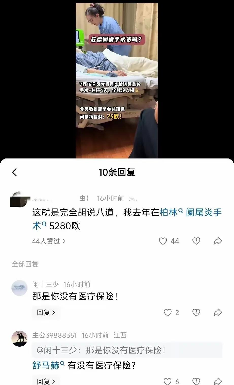 大殖子说,自己在德国,急性阑尾炎手术,住院4天,只花了25欧元! 立马就有现身说