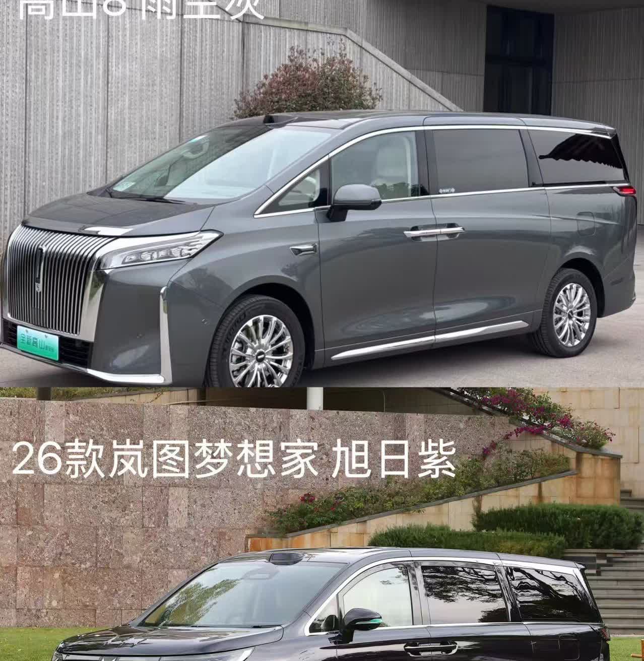 高山8 VS 26款岚图梦想家外观对比! 刚好看到26款岚图梦想家的实拍图,就把它和高山8放在一起,对比一下~ 两款车风格不太一样:梦想家颜色偏沉稳,带一点灰度,质感比较高级;高山8的黑色和金色则更纯粹亮眼。 还有一个挺惊艳的梦想家限定色金銮红,实车很有记忆点。 整体来说,两款MPV的颜色和外观设计各有特点,一个偏商务稳重,一个更时尚运动。建议有兴趣的话还是去看看实车和实拍图,感受更直观!