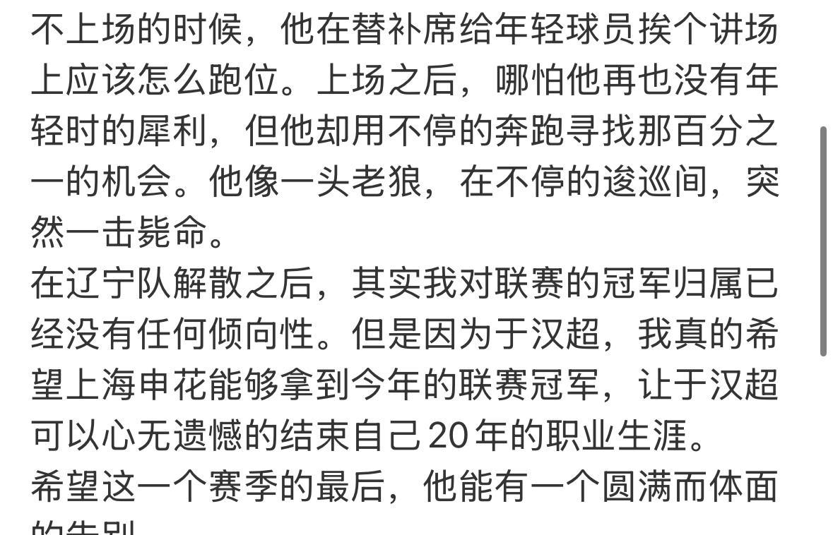 媒体人赵震今天发了一篇长文,透露了上海申花球员于汉超对于联赛冠军的渴望之心。于汉