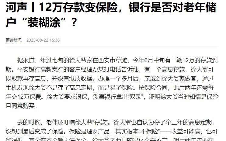 太荒唐了!陕西西安,一老汉手里12万存款到期,银行经理说有高额利息存款可以办,老汉随即签字办理,不料,两个月后老汉突然发现存款竟变成了理财产品,后续还要再缴纳24万,这下傻眼了…… 据《顶端新闻》8月22日报道,事情发生在今年6月份,年过七旬的徐大爷一听说存款利息高就兴冲冲地去了,只是没想到这竟是一个坑。 徐大爷和老伴张老太都已退休,平日里靠退休金就能维持生活,这些年他们一共积攒了12万元存款,今年6月份存款到期,张老太就提醒徐大爷把钱再给存上。 6月11日这天,徐大爷来到了附近的一家银行,这里的客户经理贾某和徐大爷认识,一听要来存定期,直接就介绍了一个高息定期。 徐大爷一听年利率达到了2.5,十分激动,他在这里存了几次钱了以前从未出过问题,于是就在贾某的引导下把12万转存了过去。 可过了一个月,徐大爷的家属在查看手机银行信息时却发现,徐大爷办理的是理财保险业务,需要交三年费用,一年12万,也就是说,徐大爷还要再交24万元才能享受收益。 这下,徐大爷夫妇直接傻眼了,他们已经退休,实在拿不出24万来,而且徐大爷记得自己当时办理的就是存款业务,怎么就成保险了呢? 徐大爷到了银行找贾某讨说法,可银行却说贾某休假了,徐大爷就问工作人员,工作人员却说徐大爷已经签了合同,而且有录音录像,还有签字可以证明,无法办理退保。 徐大爷很是难受,如果真的办不了,只能再想办法借钱续上。 随后,徐大爷还打电话给了银保监会的投诉电话,可对方也是一样说辞。 徐大爷再三强调当时贾某告诉他办理的就是存款,他是相信银行才直接签字的,至于银行的合同他根本看不懂也没有细看,觉得这都是银行的问题。 只是,白纸黑字就摆在那里,徐大爷的这笔钱怕是不好要回来了。 有不少网友表示此前家里老人也遇到过类似的情况,但最终的结果往往是只能继续交钱,有些打官司的最后也是没有打赢。 还是希望有关部门能够加强对银行及银行工作人员的监管,不要让老百姓寒心。 目前,徐大爷还在积极与银行及保险公司沟通当中,他对当初办理业务的举动很是后悔,要是不贪这点便宜也许就不会发生这种事了。 对此,大家又是怎么看的呢?