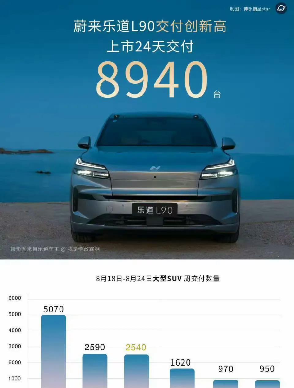 蔚来乐道L90第一个月的交付量,来到了8940辆,在大型SUV交付量上杀进前三,