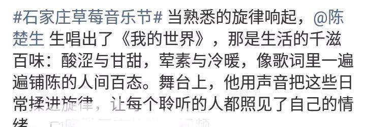 这才是歌王陈楚生的最强底牌! 原来,陈楚生参加完湖南卫视《歌手2025》节目后,他接下来获得了很多的演出资源。 石家庄草莓音乐节,给了陈楚生一次表现自我的机会! 陈楚生在舞台上深情一唱《我的世界》,用充满磁性的声音,感染了众多观众。 音乐就是歌手对社会人生的一种理解! 陈楚生最强底牌非常简单,那就是自身的实力! 有实力的歌手,从来都不缺少演出机会! 陈楚生一路走来,所向披靡,见证了一位歌王的成长! 祝福陈楚生!