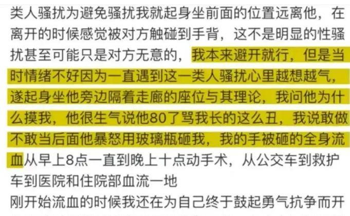 到底谁的错?湖南长沙,一女子乘坐公交时起身更换座位,突然觉得手背被旁边老人摸了一下,当场质问,不料,老人却说她长得丑,女子不甘示弱,老人一气之下拿起玻璃瓶朝女子头上砸去…… 据《杭州日报》8月23日报道,事情发生在8月20日这天,周女士(化名)乘坐502路公交外出,当时就坐在后车厢靠近车门的位置。 在经过一处站点时,一位8旬老汉走了上来,径直来到后车厢,坐在了周女士旁边的空座上。 这让周女士感到很不自在,担心被老汉骚扰,看到前面正好有一个空座,就起身打算坐到前面去。 她直接示意让老汉起身让一下,老汉照做,不料,周女士在从老汉身边经过时突然觉得手背被老汉摸了一下,这让她十分愤怒。 此时车辆还在行驶中,周女士却不顾个人安全,直接就质问老汉为什么摸她。 老汉听后同样十分愤怒,觉得她是无理取闹,一开始没有理会,可周女士再次质问,老汉也不惯着,直接大声说:“我今年80了,哪有这心思,再说你长得这么丑,也不知道拿镜子照照!” 听到这话,周女士更加愤怒,大声嚷嚷指责老汉为老不尊,还说如果不道歉这件事没完。 老汉看到车里那么多乘客,觉得自己名誉被玷污,心里更加愤怒,当即拿起身边的玻璃瓶直接砸到了周女士砸去,周女士用手挡住了头部,手部流血,直接拨打了120求救。 车上有乘客拨打了110报警,可周女士还是要追究老汉的责任,她还发文说自己从早上8点到晚上10点一直在做手术。 而老汉也很生气,同样要求警方仔细调查,一定要还他一个清白,他说活到这般年纪最看重的就是名声,决不能任由女子诬陷。 随后,警方调取了车上监控,发现老汉并未有主动触摸周女士手背的动作,周女士事后发文也承认这不是明显的性骚扰,老汉可能是无意的,不过,她还是认为老汉言语过激以及拿玻璃瓶行凶的行为不对。 目前,案件还在进一步处理当中。 这件事传到网上以后,广大网友也是议论纷纷,不少人表示不管怎么说,老汉动手打人就是不对的,理应受到惩罚,可也有人觉得周女士反应过激,毕竟没有证据证明老汉存在性骚扰行为。 对此,大家又是怎么看的呢?