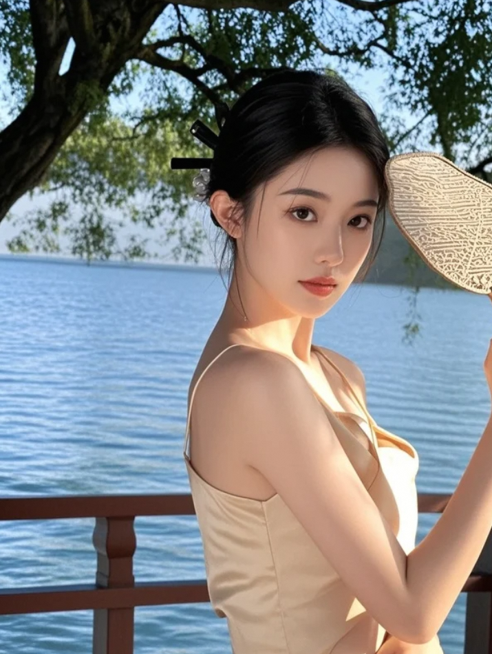 她不说话,只轻轻一扇,便搅动了整片湖光