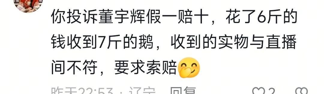 必须吐槽一下,与辉同行卖大鹅的商家发的大鹅严重与直播间的不一样!明明说好的重量是6斤到6斤半,一不小心称了一下,怎么变成7斤多了呢?[笑]商家这么干,董宇辉知道吗?[我想静静][我想静静] 这是网友在评论区所谓的“吐槽”。这正话反说的方式也太有意思了。 这两天大家在与辉同行黑龙江行买的大鹅陆续到货了,铁锅炖大鹅呼之欲出。 要我说东北的商家实在是太实在了。明明说好的6斤到6斤半的鹅,有朋友就用在与辉同行买的体脂秤称了一下,重量竟然达到7斤1两。如果按6斤来算的话,是整整多了一斤一两。 不要怀疑秤不准,用的可是体脂秤哦。 这种操作也是会传染人的[笑][笑]有位朋友看到别人称重,本来准备睡觉的,马上爬起来,把自家的鹅秤了一下。果然没让她失望,7斤4两。 东北人果然实在。就按6斤来算,一斤大鹅才16块多,现在倒好,动不动就是在7斤以上,14块一斤都不要了。那么便宜,还配上了两包酱料包。 这下评论区热闹了。 有人说:幸亏当初没买,这鹅太大了,锅不够大。 有人说:商家太不地道了,说好的6斤,偏偏要给7斤多。多出来的一斤谁吃?大鹅吃下去倒是容易,可长出来的肉肉要想减下去老难了?这一点董宇辉跟商家都不知道的吗[我想静静][我想静静] 有人说:必须投诉董宇辉,让他假一赔十。花了6斤的钱,却收到了7斤的鹅,收到的实物与直播间严重不符合,要求索赔[我想静静][我想静静] 要我说东北人就是那么实在,人家嫌多出来的一斤还要费事剁下来,还不如直接打包。 董宇辉昨天在直播间也哭笑不得:你们这帮消费者真不好伺候,有嫌鹅大的,有嫌鹅便宜的[笑][笑] 说实话我不嫌鹅大,也不嫌便宜,我的已经分成4份冻进冰箱里了,像我们这种小家庭,每次炖一份就行了。 大家都收到东北大鹅了吗?有没有秤过,是不是都多出来不少?[笑][笑]