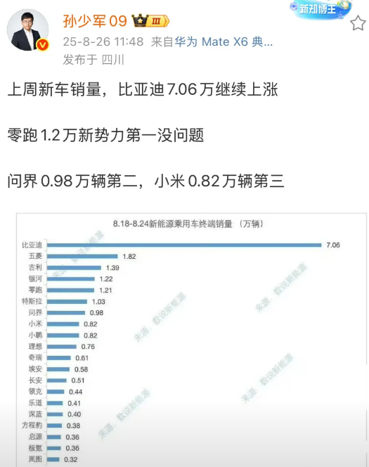 今天下午,孙少军发出来上一周的销量,第一名比亚迪无可争议,主要看后面!