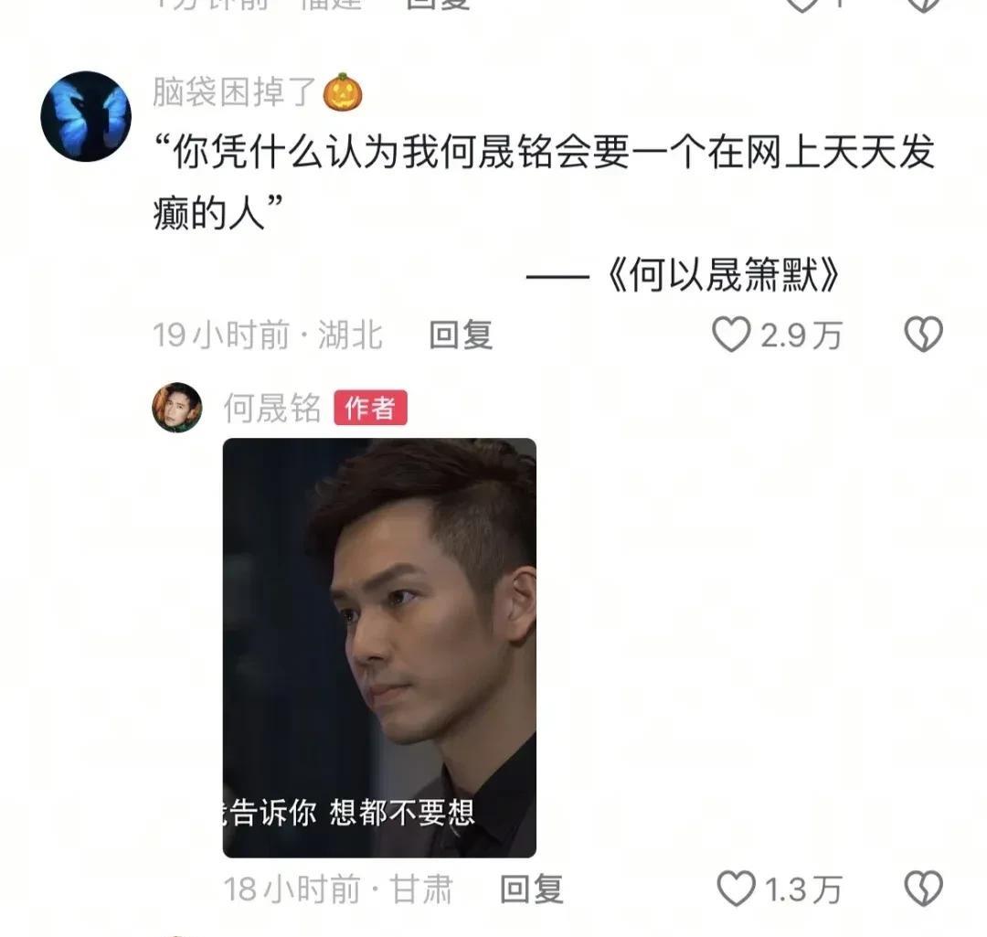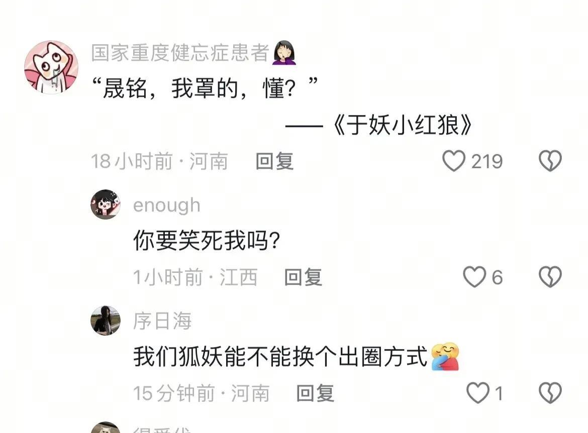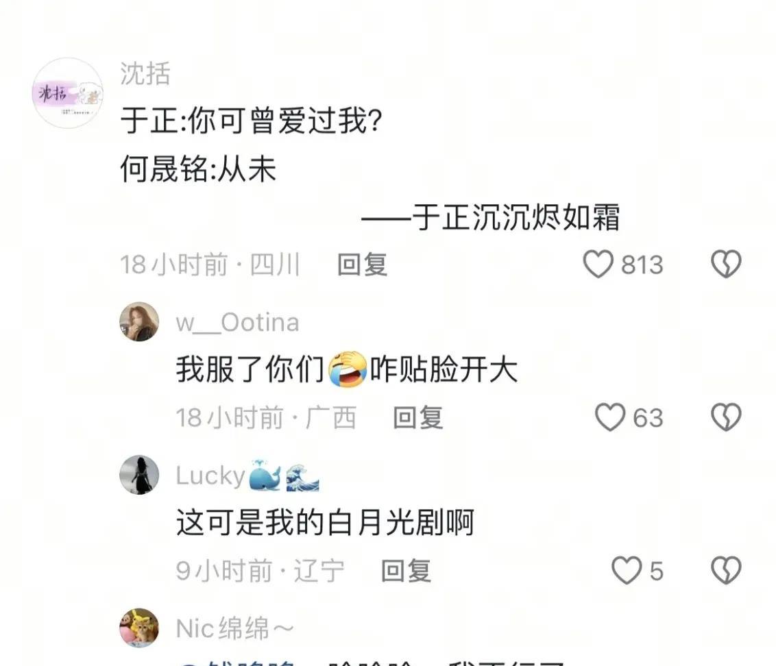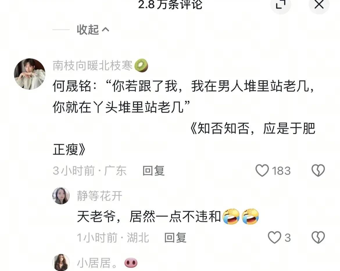 陷在何晟铭评论区出不来,离了死丫头谁还能逗我笑[捂脸] 本来一场危机,现在谁还在乎许凯和谁谈恋爱,我现在只关心何晟铭什么时候给于丫头名分,他俩啥时候官宣 网友太有梗了,平时电视剧看太多,一个个梗都看得懂也不是什么好事,经常一刷一小时出不来,真出不来 “我想带一人回欢娱,带回去,藏起来。” ———于忘鸡《魔道晟铭》 我无法直视我的忘羡了[呲牙] 谁不说何晟铭是最体面的白月光呀!说要流量,但是也不带货,也不接广告,这不就是最好的官宣吗?