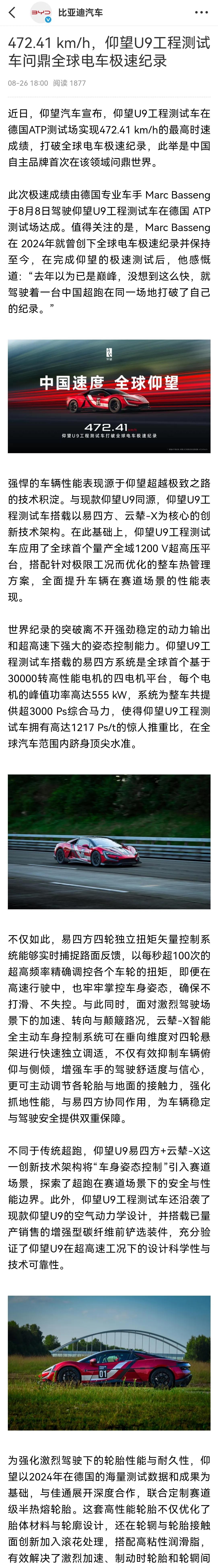 奔驰概念车AMG GT XX电动车连续破下惊人的记录(比如24小时高环耐力跑出5479KM,极速破360KM/H,平均速度破300KM/H),代表了世界传统车企在电动车领域挥出的利剑,他们要夺回汽车行业的技术领先优势。 中国汽车要应战发招吗? 仰望U9工程车以472.41KM/H打破了全球电动车的极速记录,代表着全球领先的技术。 来高环耐力测试?我相信中国车企很快会来挑战的,在新能源技术领域,中国已经领先,不会不怵任何外国车企外国品牌。