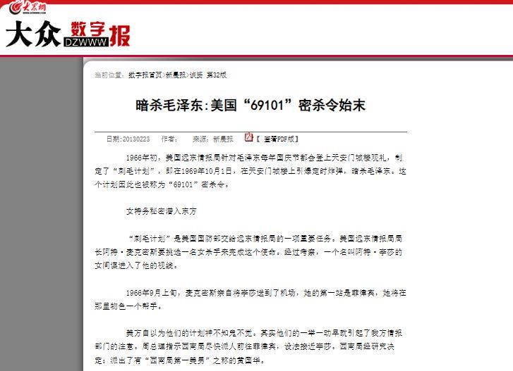1966年,美国为了暗杀伟人,派出了一个培养了多年的女特工,没想到他们的计划,却被黄国华给化解了。 主要信源:(大众网——暗杀毛泽东:美国“69101”密杀令始末) 1969年10月1日,是新中国成立二十周年的重要日子,全国上下本应沉浸在节庆的欢腾之中。 而此时一场由美国特工精心策划、代号为“69101”的刺杀行动却悄然逼近,目标直指国家伟人。 我方情报机构提前截获相关线索,在美国特工尚未准备就绪之前迅速展开反制。 为彻底粉碎这一阴谋,情报部门派遣了一位外貌出众、机智敏锐的情报人员深入敌后,利用特殊身份接近敌方核心人员,最终成功阻止事件发生。 早在朝鲜战争结束后,美国便将中国视为其在亚洲的主要对手,不断试图通过各种手段削弱中国实力。 美方认为,若能成功实施对毛主席的刺杀,将极大动摇新中国的稳定与发展。 但多次尝试均告失败,中国严密的安全防护网络让美国特工难以近身。 直至1966年,美国远东情报局受高层指示重启刺杀计划,并将行动日期定于1969年国庆日,代号“69101”,由阿特·麦克密斯将军全权指挥。 麦克密斯是经验丰富的情报官员,曾参与二战,对中国安全机制有深刻了解。 面对此前屡次失败,他决定利用国庆典礼人员密集、安防难度大的特点寻找突破口。 他选派其养女李莎执行关键任务。 李莎生父原为国民党将领,在战争中被击毙,后由麦克密斯收养并培养为高级特工。 她精通多国语言,擅长伪装与心理战术,此前多次参与机密行动并表现出色。 根据计划,李莎先潜伏于菲律宾,以华侨身份进行活动,逐步建立掩护背景。 美方投入大量资源,提前数年布局,企图通过她接近典礼核心区域,最终实施暗杀。 可中国情报部门早已密切关注相关动向,虽未掌握全部细节,但已判断出大致行动方向。 为确保万无一失,我方并未立即抓捕李莎,而是决定深入诱导,摸清整个行动网络与实现手法。 情报部门经慎重研究,决定派出优秀情报员黄国华执行反间任务。 黄国华不仅外形俊朗、气质非凡,且具备极强的应变能力和心理素质。 他幼年时父母因从事地下工作牺牲,由叔父抚养长大,并很早就加入情报系统工作。 为取得李莎信任,我方为黄国华设计了特殊身份。 让他伪装成已故国民党高官后人,并虚构其与李莎生父有旧交,以拉近二人关系。 黄国华以剧团演员身份赴菲律宾演出,该演出广泛宣传,吸引大量当地华人观看,李莎也混入其中。 演出期间,黄国华多次登台,试图引起她的注意。 李莎虽留意到他,却始终保持警惕、未轻易接触。 直至演出结束散场时,她故意制造了一场“意外相遇”,二人由此结识。 黄国华顺势展开情感攻势,频繁拜访、送礼物,逐步赢得李莎好感。 随着交往深入,李莎开始对黄国华进行多次试探,甚至不告而别前往伦敦,留下模糊线索。 黄国华果断追至英国,最终消除她的疑虑。 李莎放下戒备后,坦白了自己的特工身份及此行任务,还将他引荐至美军基地接受训练,共同准备入境行动。 1969年,二人一同抵达中国。 黄国华趁李莎不备,将其迷晕,并迅速将她与携带的机密文件移交我安全部门。 通过对李莎的审讯及相关物证分析,我方彻底掌握了“69101计划”的全部内容,并将涉案人员一网打尽,彻底挫败了这场刺杀阴谋。 伟人一生曾多次面临暗杀威胁。 早在抗战与解放战争时期,国民党当局就多次试图对他下手,手段包括投毒、狙击甚至空袭。 但均在安保人员和人民群众的严密防护下化险为夷。 最惊险的一次是在延安时期,国民党军统特务潜入伟人住所附近企图行刺,幸被警卫及时发觉并制服。 而美国情报机构也长期将毛主席列为重点目标,但每一次行动均被粉碎。 黄国华因这次行动立下大功,获得国家表彰。 但他并未止步于此,继续坚守在情报战线上,多年后在一次海外任务中英勇牺牲。 如他一样,无数隐蔽战线的英雄们默默奉献,甚至献出生命,守护国家的安全与和平。 他们的功绩和精神,值得永远铭记。 对此您怎么看呢? 麻烦各位读者点一下右上角的“关注”,留下您的精彩评论与大家一同探讨,感谢您的强烈支持!