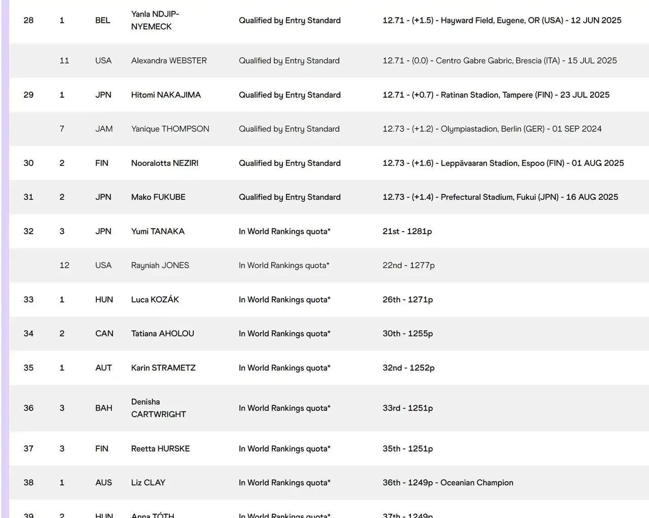 吴艳妮通过世界田联积分排名“压线”入围东京田径世锦赛,这是中国运动员自2015年之后时隔十年再获世锦赛该项目资格。按照世锦赛规则,女子100米栏每个代表队最多有3个参赛名额,总计共有40名选手获得参赛资格,吴艳妮本来排在第40,刚好在晋级线上,而在昨天,24岁的法国巴黎奥运会亚军赛雷娜·桑巴·马耶拉在社交平台上发文宣布因伤退出世锦赛,吴艳妮的排名上升到第39,由于资格确定截止期是8月27日,也就是明天,而剩下几个小时已经不会有运动员直接达标或在排名上超越吴艳妮,所以,她就成为本届世锦赛该项目唯一的中国参赛选手,从而实现了奥运会、世锦赛、室内世锦赛、亚运会、亚锦赛、钻石联赛等各项世界大赛的全出席。