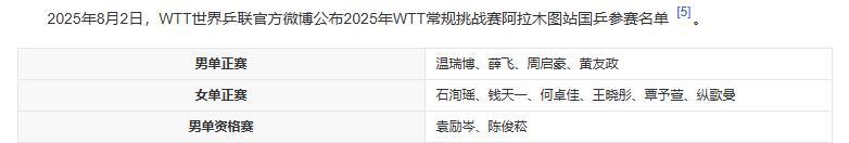 WTT阿拉木图挑战赛,又是老将钱天一和薛飞坐镇。 天呐,他们两个快成教练了。 这次比赛, 由18岁小将温瑞博 和23岁中将石洵瑶率领。 男单只有四人, 剩下两个是周启豪和黄友政, 黄友政这次双打不错, 就是决赛掉了链子, 也不知道咋回事? 男乒有了后继无人的感觉了 女乒也差不多吧,