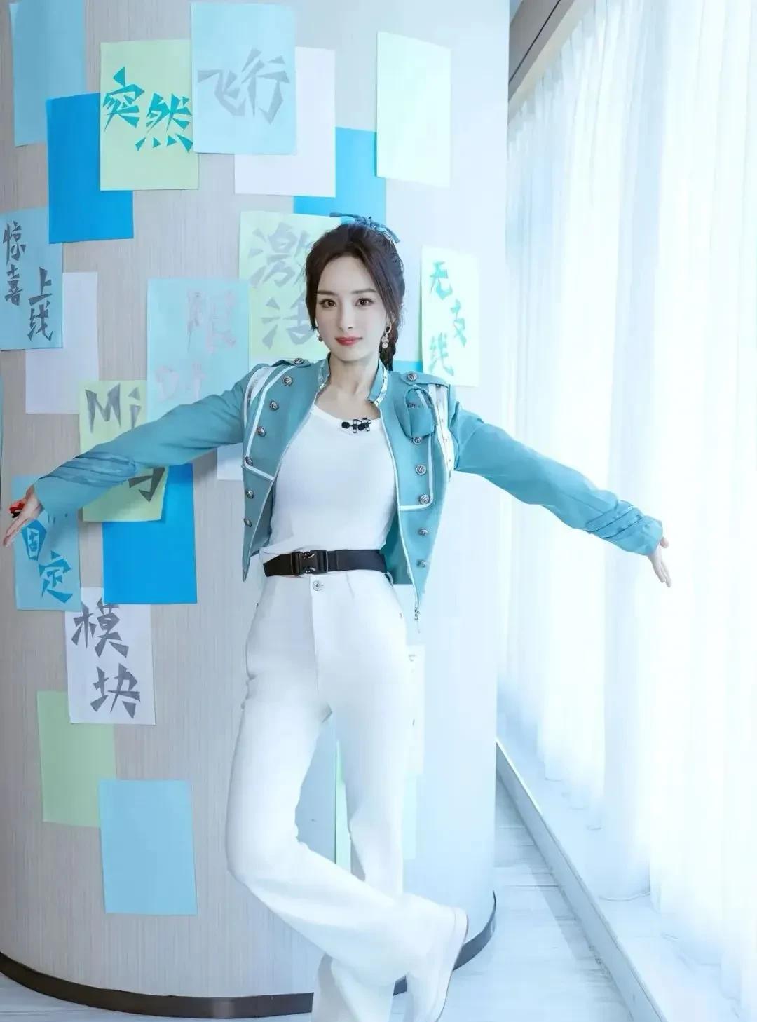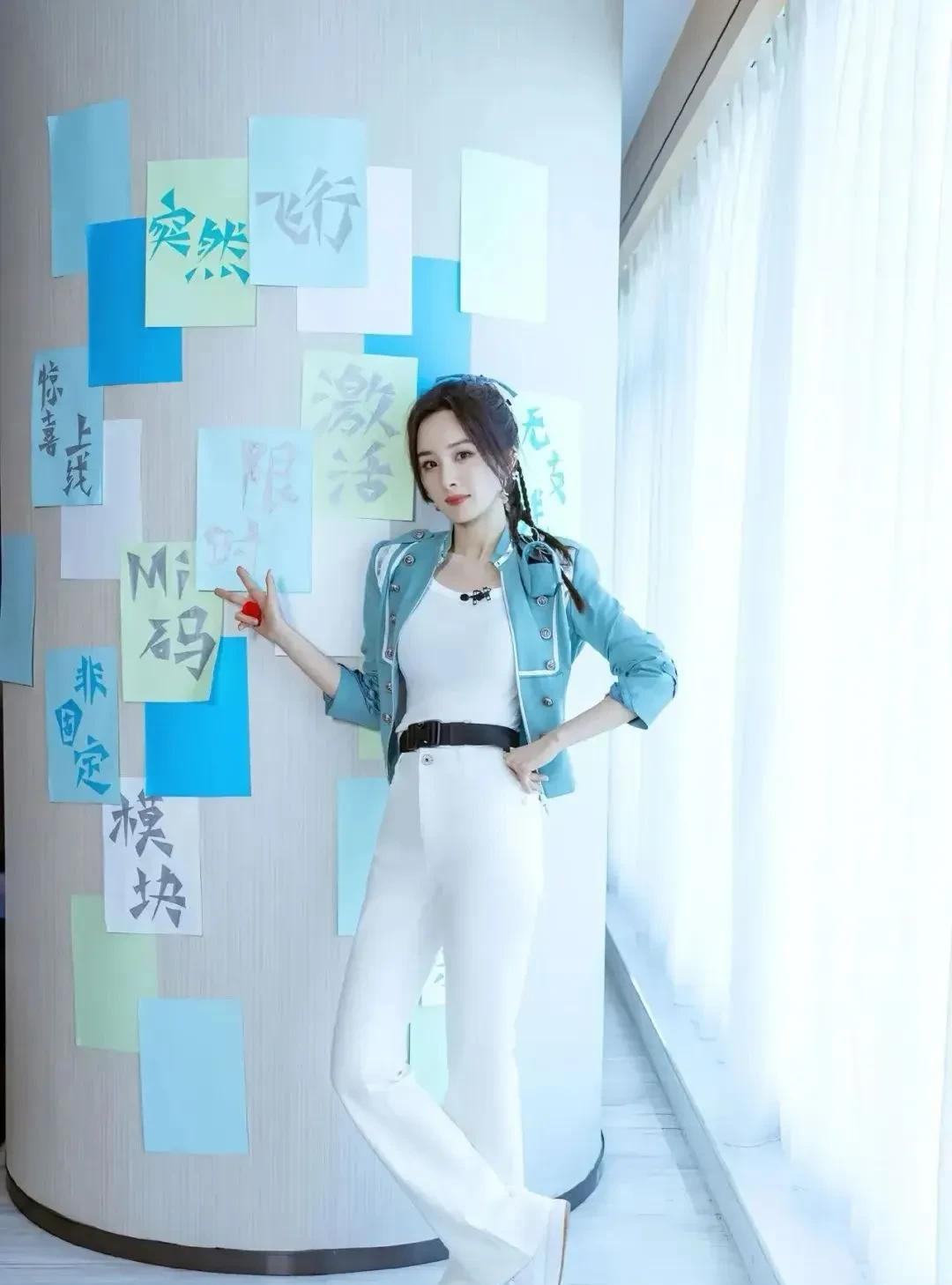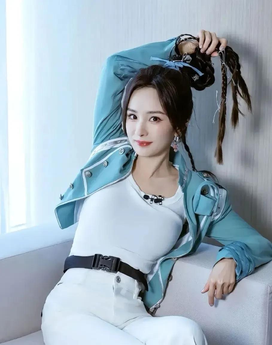 杨幂浅蓝短外套搭白T,编发灵动,或慵懒托腮、或活力比耶,身材凹凸藏不住,美到开挂