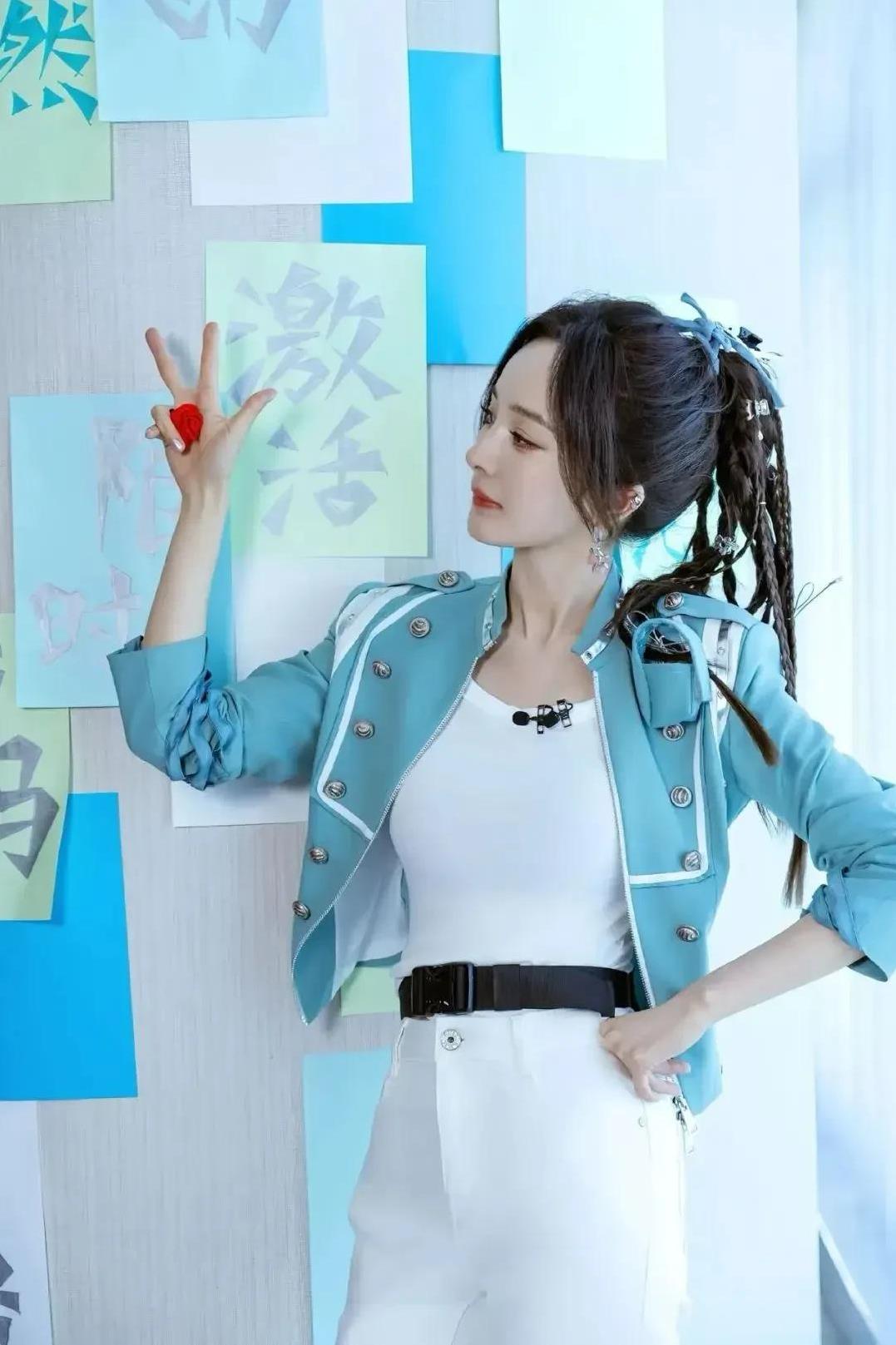 杨幂浅蓝短外套搭白T,编发灵动,或慵懒托腮、或活力比耶,身材凹凸藏不住,美到开挂!