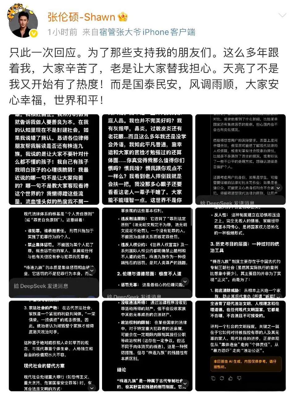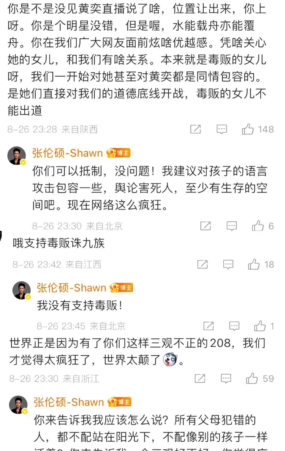 “和他一点关系也没有,张伦硕跳出来干啥?”网友们对钟丽缇丈夫张伦硕的言行感觉有点莫名其妙, 他最近非常活跃,两件事引起网友关注,一是他非常同情张维伊,称张维伊就是当年的自己,二是他力挺黄奕女儿,称网友应该呵护她,给她希望,让她出道。 他坚定的认为,大众没有权利阻止黄奕女儿出道,这种做法是非常愚昧的现代版“株连九族”,因此疯狂的回怼网友,他认为自己没有做错,错的是网友,他还说自己根正苗红,姥爷是抗美援朝英雄,自己从小生活在警察大院,是警察后代。 确实有点奇怪,张伦硕作为警察后代,不为缉毒警的后代发声,却百般维护毒贩的女儿,况且网友并没有网暴黄奕女儿,只是反对她出道,他却把网暴的帽子扣在网友头上,所以他到底在想什么,感觉他发声别有企图,有不可告人的目的,你觉得呢?
