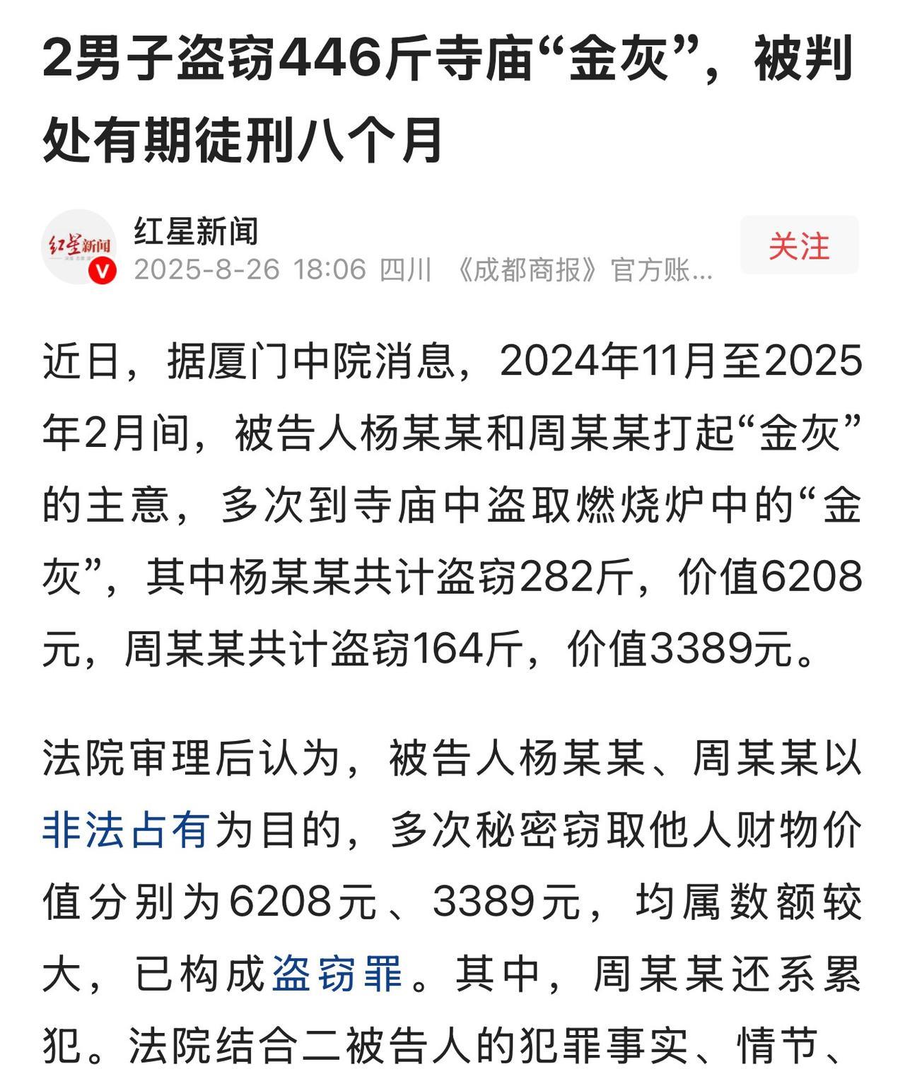 福建厦门,二男子听说寺庙里的金灰能卖钱,就打起了如意算盘,做起了发财梦。三个月内,二人多次溜进寺庙,盗走大量金灰,其中一人盗窃282斤,价值6208元,另一人共计盗窃164斤,价值3389元。被抓后,二人还狡辩,不知道盗窃金灰是违法行为。最终,法院分别判处二人有期徒刑8个月,并处罚金。 据红星新闻8月26日报道:近日,厦门中院公布一起关于盗窃金灰被判刑的案例,引发网友热议。 有不少网友看到这则新闻后,一脸懵,提出疑问,啥是金灰,金灰难道比猪肉都贵?偷个灰还要判刑吗? 带着网友的种种疑问,我们来说说这起案例! 事情得从2024年11月说起,那会儿厦门天气刚转凉,不少人会去寺庙烧点纸钱、金纸,求个平安顺利。 可谁能想到,杨某某和周某某这俩主儿,没想着求平安,反倒盯上了燃烧炉里那堆黑乎乎的“金灰”。 他们早就打听好,这金灰是烧过金纸后留下的,里面藏着点金属成分,攒多了能卖钱。 从那之后,二人经常鬼鬼祟祟的,专挑寺庙人少的凌晨或者傍晚往里头钻。 每次去都背着大布袋,溜到燃烧炉旁,趁没人注意,蹲下来就往袋子里扒拉金灰。 转手就将金灰高价卖出,二人发现这个来钱道是又轻松又来钱快,尝到了甜头,心里乐开了花,从此一发不可收拾。 二人就这么神不知鬼不觉的在佛 祖的眼皮子底下偷走金灰。 然而,常在河边走哪有不湿鞋,直到2025年2月,寺庙里的金灰丢得越来越频繁,才报了警。 帽子叔叔一调监控,很快就锁定了杨某某和周某某。 等把俩人抓着的时候,他们家里还堆着好几袋没来得及处理的金灰,一称重才知道,杨某某居然偷了282斤,算下来值6208元;周某某也没少偷,164斤的金灰,价值3389元。 二人对自己盗窃的事供认不讳,但他们一口咬定不知道盗窃金灰是违法行为,不知者无罪。 帽子叔叔怎么会信他们的狡辩,直接以盗窃罪立案。 没想到,这件事曝光后,网友们竟替二人求情:那黄金粉粖是众多香客留下尘灰,又不是寺庙里所有权,指他人财物太广义了,偷那种灰也立案? 偷这种纸灰的人,肯定是穷苦人民,对他们警告一下可以了,何必小事大做! 那么,在法律面前角度,来认定一下二人偷金灰的行为。 1、我们来了解一下什么是金灰? 金灰是指锡箔金纸钱等在燃烧炉中燃尽后留下的灰烬。 在闽南地区,人们逢年过节、红白喜事时会焚烧锡箔金纸钱,其燃尽后的灰烬中含有高价值金属成分,因此被称为金灰”。 在寺院里,一些信众为了表达虔诚,还会将金银饰品、硬币等投入燃烧炉,这些物品经过高温焚烧后,纸张化为灰烬,而金银等金属则会残留下来,也成为金灰的一部分。 金灰中含有铝等金属成分,可以回收和重新利用,具有一定的经济价值。 2、二人的行为构成盗窃罪,毋庸置疑。 《刑法》第264条规定 ,盗窃罪是指以非法占有为目的,盗窃公私财物数额较大或者多次盗窃、入户盗窃、携带凶器盗窃、扒窃公私财物的行为 。其中,盗窃公私财物价值1000元至3000元以上的,认定为数额较大。 金灰虽为灰烬,但仍属寺庙、宗祠或祭拜者集体所有。 寺庙对其管理范围内的金灰具有相应的保管和处理权,他人未经允许擅自窃取,属于非法占有公私财物的行为。 从法律理论角度来看,香客将金灰遗弃在寺庙香炉中后,寺庙通过“先占”取得了金灰的所有权。 杨某某和周某某明知金灰有主,仍以秘密手段窃取,符合盗窃罪的构成要件。 并且偷的金灰价值均超过1000元,符合盗窃罪的立案标准。 3、民警调查后发现,周某某曾因盗窃坐过牢,这次又盗窃金灰,系累犯。 《刑法》第65条规定:被判处有期徒刑以上刑罚的犯罪分子,刑罚执行完毕或者赦免以后,在五年以内再犯应当判处有期徒刑以上刑罚之罪的,是累犯,应当从重处罚 ,过失犯罪和不满十八周岁的人犯罪的除外。 周某某之前和这次都因盗窃被判处刑罚,后罪发生在前罪刑罚执行完毕后的五年内,属于典型的累犯,法院在量刑时依法对他从重处罚。 最后,法院认定二人窃取他为财物分别为6208元、3389元,均属数额较大,已构成盗窃罪。 结合二被告人的犯罪事实、情节、认罪认罚等情况。 酌情对二人分别判处有期徒刑8个月,并处罚金。