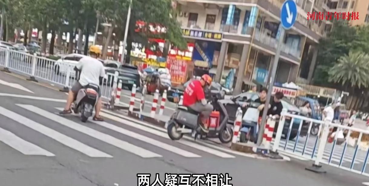 “离了个大谱!”8月24日,广东惠州,一外卖员和另外一位路人在过马路时,因为互不