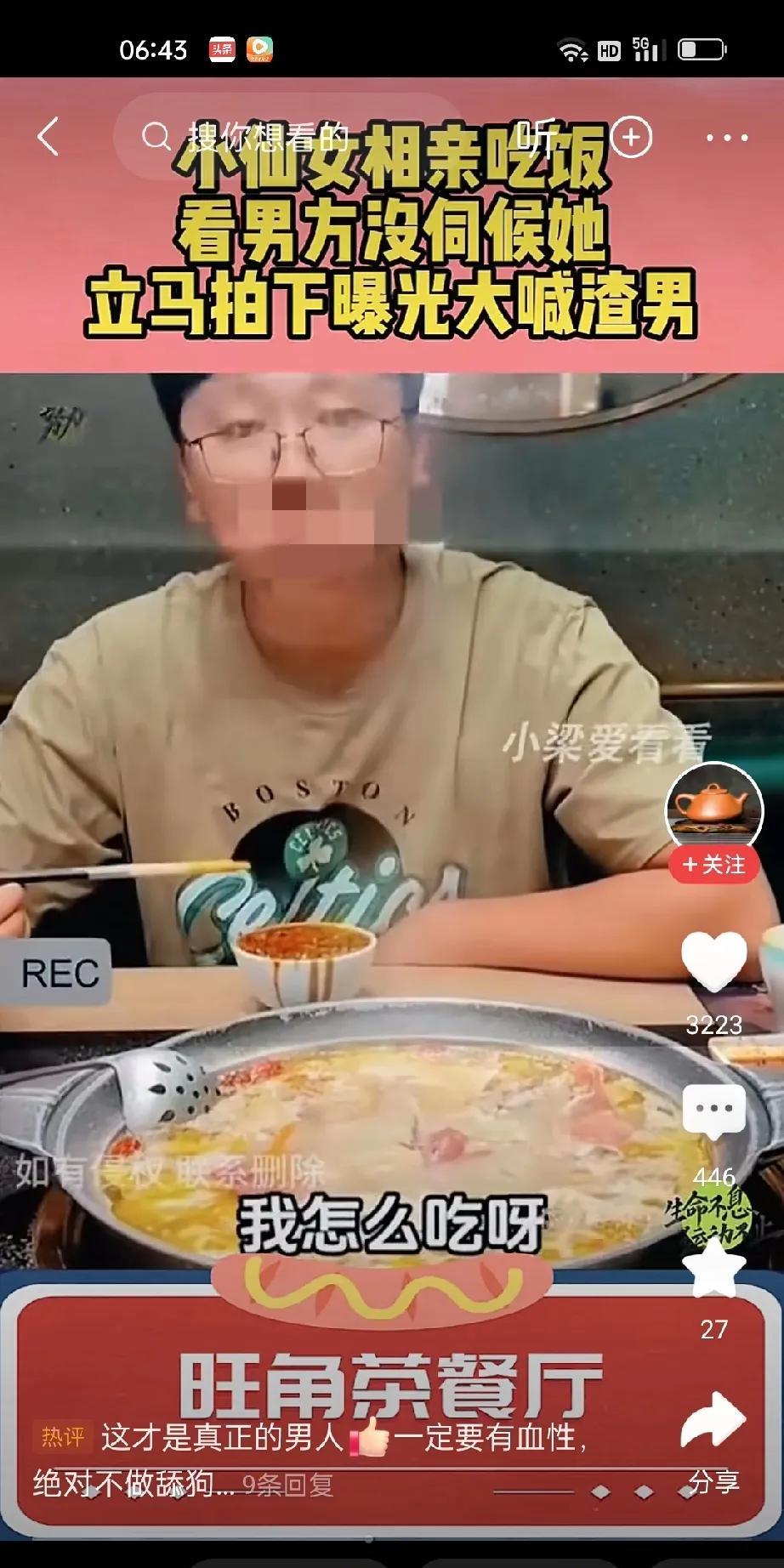 小仙女和男子相亲吃饭。男生吃的正起劲,看女生还没动筷子,就问她,你为什么不吃啊?小仙女看男方没有伺候她,有点生气地说,你没给我打蘸料,我怎么吃啊?男生一听这个,没有怜香惜玉,反而大声呵斥,不吃滚,赶紧滚。小仙女眼泪汪汪的,拿起包就走。男子却在后面叫住她,别忘了买单,这个火锅是你要吃的。真是个奇葩男。不懂得照顾女人就算了,还这么抠门,这一辈子打光棍吧。