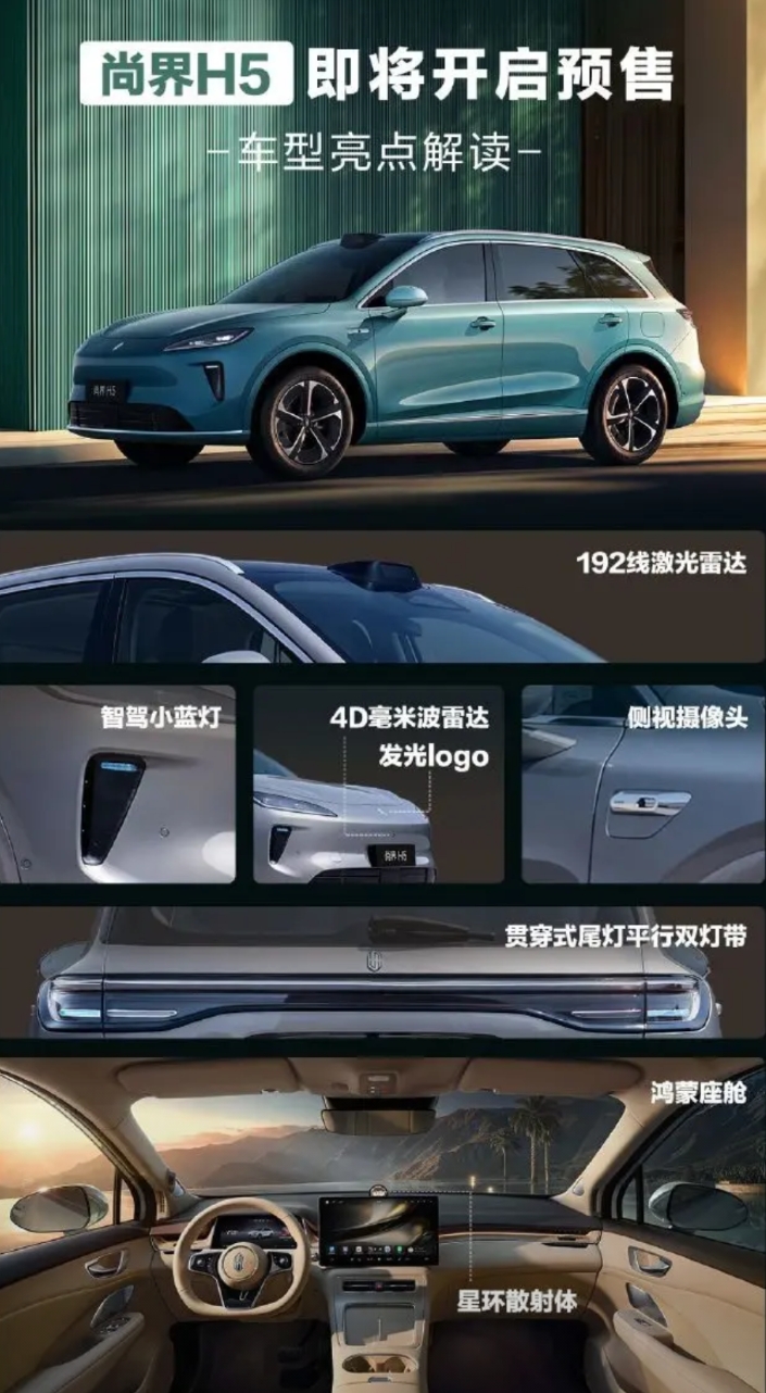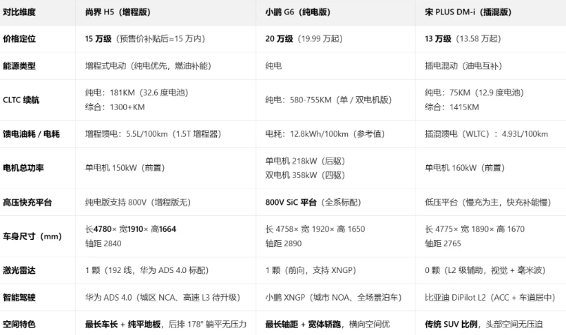 华为发布尚界H5,最受伤的,应该是小鹏! 鸿蒙智行第5界—尚界H5,终于发布,预售价16.98万的价格,让小鹏G6感觉到一阵凉意。 看这尺寸比例,完全拿卷尺量的: 尚界H5:长4780,宽1910,高1664,轴距 2840 小鹏G6:长4758,宽1920,高1650,轴距 2890 还有ADS4.0,问界M9同款192线激光雷达+4D毫米波雷达,支持无图城市NCA、跨层泊车代驾、雨天探测距离300米。 不只有纯电,还用增持1300+KM的续航,让G6很难受! 小鹏G6在7月份总共销量3949辆,不晓得会被尚界H5吃掉多少! 车企卷起来真是好事,这波站尚界,外形爱了,至少比起G6那个特里特气的孩子好看多了! 另外,不晓得宋DMi会不会被影响,毕竟价格差距还是有点的!