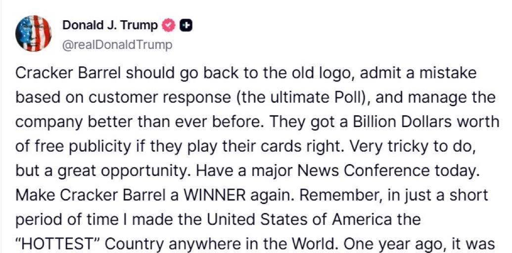 美国乡村主题餐厅Cracker Barrel 在一份声明中表示,将恢复使用旧标志,因为公众对这家餐厅和乡村商店最近的标志更改和重新设计表示强烈反对(图7为新旧logo对比,改logo之日股价跌12%): “感谢宾客们分享你们的心声以及对 Cracker Barrel 的喜爱。我们说过我们会倾听,我们也确实做到了。我们的新标识将不再使用,而“老标识”将保留。 在 Cracker Barrel,我们始终——并且永远——致力于提供美味佳肴、热情款待以及如同家人般温馨的乡村待客之道。作为一家值得骄傲的美国餐厅,我们 7 万名辛勤工作的员工期待着您的光临。” 特朗普也发帖回应: “恭喜“Cracker Barrel”将你的logo改回了原来的样子。你的粉丝们都非常感激。祝你未来一切顺利!赚大钱,最重要的是,让你的顾客再次满意!”