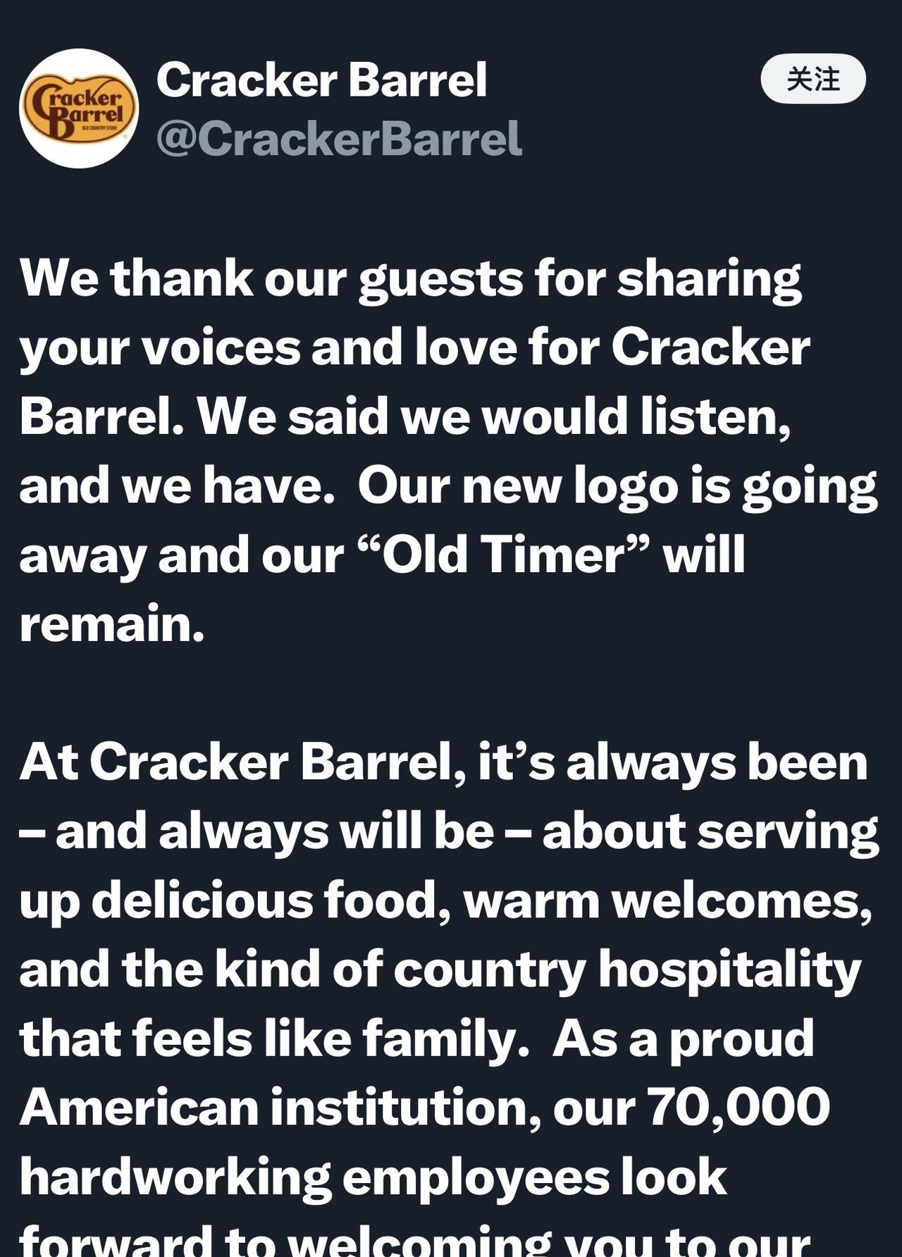 美国乡村主题餐厅CrackerBarrel在一份声明中表示,将恢复使用旧标志